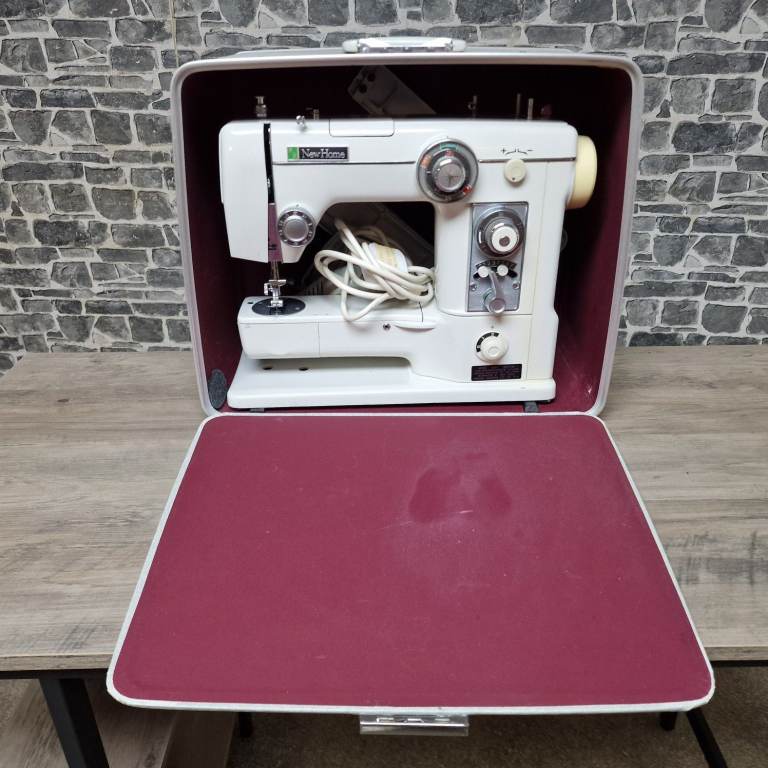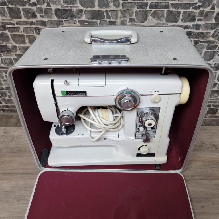Vintage New Home portable sewing machine complete with its original hard carry case. This is a well-made, solid machine with classic mid-century styling and chrome detailing. It features multiple stitch settings, adjustable controls, and a compact fold-away design making it easy to store or transport.