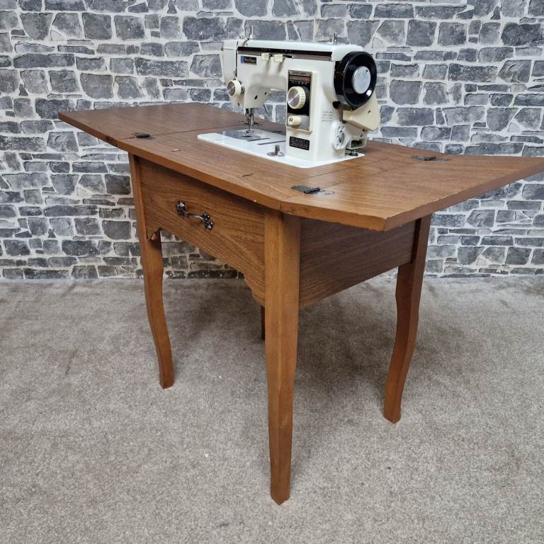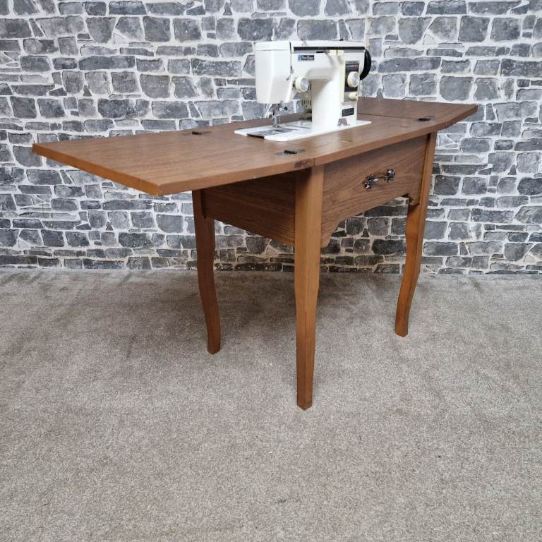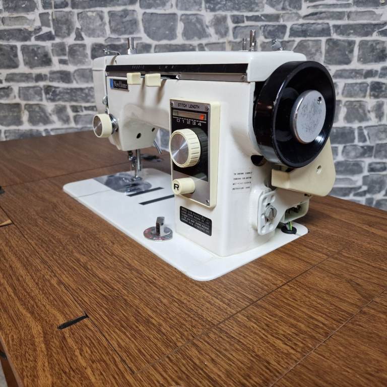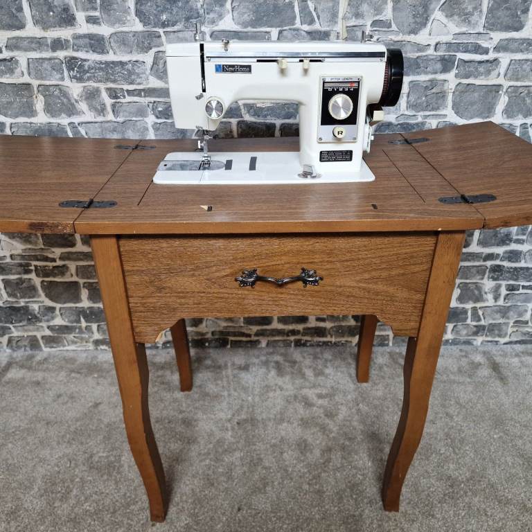Vintage New Home sewing machine mounted in a solid wooden folding cabinet table, featuring drop-leaf extensions for extra workspace and compact storage when closed. This classic machine has a sturdy build and attractive retro design, ideal for restoration, display, or sewing use. The cabinet is in good vintage condition with general signs of age and use, and the machine appears complete; however, it does not have a power cable and is therefore untested. Dimensions: L 56 x D 45 x H 70 cm