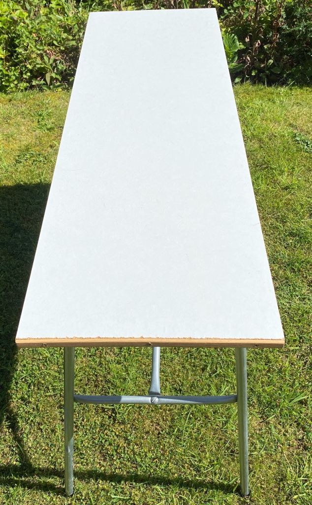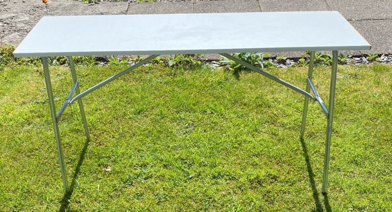 White effect laminated table top with carpet protectors intact. When expanded sits approx. 70 cms from floor. 120 x 31cms length x width. Made for machine knitting and ribbing attachment however could be used for other stuff. Good used operational condition. Photo shows example of item for sale . Collection only