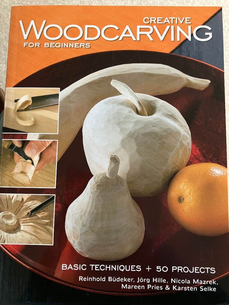 job lot: 9 wood carving chisels and curved gouges, various wood offcuts (laburnum, yew, lime) and wood carving book