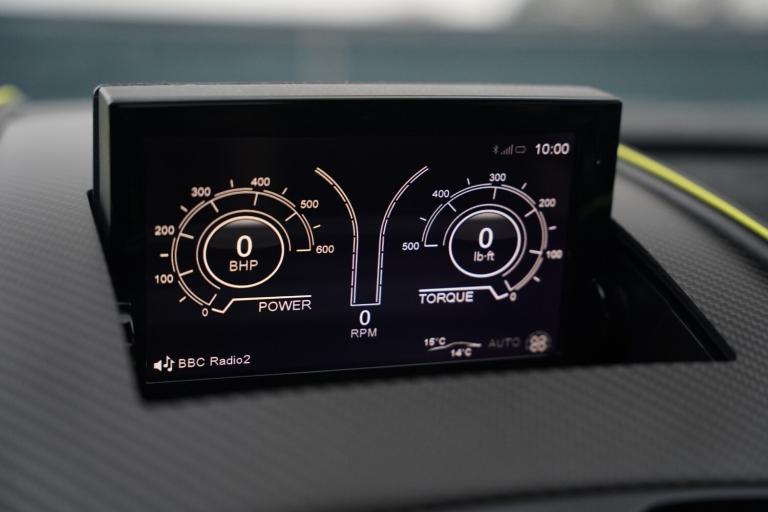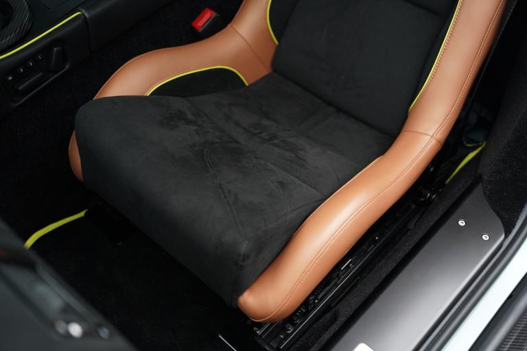 The interior follows the exterior styling perfectly, with the glorious Halo Pack colourway. The lightweight carbon seats feature Copper Tan bolsters with Pure Black Alcantara centre panels, highlighted by Lime Green piping and rear panels. The Alcantara steering wheel and dash house the carbon fibre ski slope, again highlighted with Lime Green accent and the all-important gearstick takes centre stage with its carbon surround. The door cards follow suit again, completing the aesthetic.