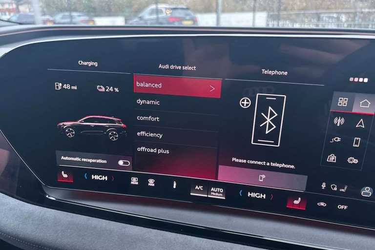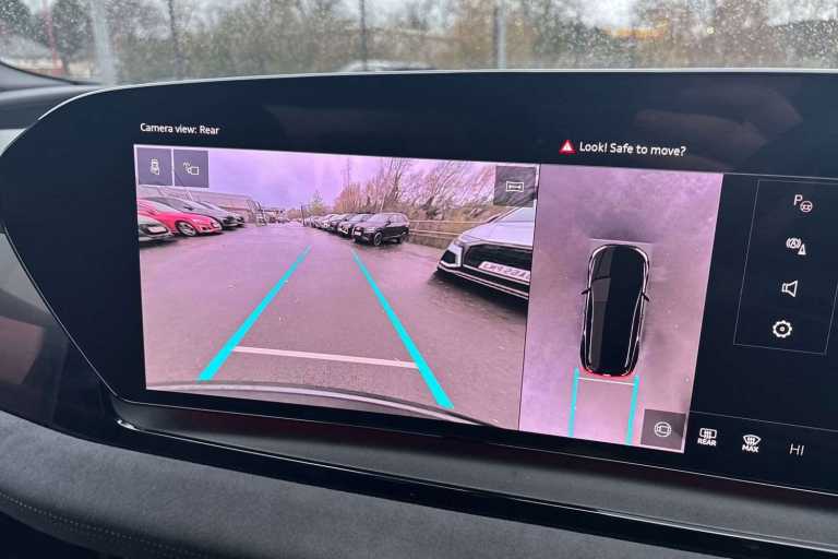 Sound and Vision Pack, Accent surfaces and control buttons, Gloss Black (GS5), Ambient Lighting package plus (QQ4), Assist package, protective and warning systems plus (99I), Augmented Reality Head-Up Display (KS5), Bang & Olufsen 3D Premium Sound System with head restraint loudspeakers (8RT), Black exterior mirror housings (6FJ), Bumpers, S line (2K7), Climate Control package for winter (98G), Comfort auxiliary air conditioning (GA2), Convenience package 2 (only for Audi/Bentley/commercial vehicles) (98C), Digital light signatures (LW1), Dinamica microfiber/leather combination with rhombus pattern (N2S), Disk brakes, front, 18-inch, brake calipers in Red (1ZD), Disk brakes, rear, 18-inch, brake calipers in Red (2EX), Door sill trims with aluminum inlays, front, illuminated, S logo (VT5), e-tron sport sound (GM3), Floor mats, front and rear (0TD), Front cross-traffic assist (JX1), Front emergency brake assist (8J5), Front head restraints (5ZJ), Front seats, electrically adjustable (3L5), Headlight cleaning system (8X8), Headlining in cloth, Black (6NQ), Interior equipment 13 (99W), Lane departure warning with emergency assist (6I5), LED headlights plus (8IY), LED rear lights pro (8VP), Lumbar support, pneumatically adjustable with massage function for the front seats (8I6), Matrix function (8G4), Memory function for the driver seat and the exterior mirrors (AI1), MMI experience pro (98S), MMI front passenger display (JH1), Proactive occupant protection, front, side and rear (7W7), Rear occupant detection (5P2), Roof rails in black (3S2), S line (FM7), S sport suspension (1BD), Seat belts (FZ1), Seat heating, front and rear (4A4), Side airbags, front and rear with head airbag system and interaction airbag, front (6C4), Side assist and exit warning, rear cross-traffic assist and rear turn assist (79H), Sport leather steering wheel, 3-spoke, flat top and bottom with multifunction and shift paddles (1XY), Sport seats plus, front (Q4Q), Stainless steel pedals and footrest (VF1), Steering wheel heating (AI9), Steering wheel trim in chrome look, S emblem, st. wheel grips in perforated leather and contrasting stitching (6F7), Sun protection glass, tinted (QL5), Swerve assist and front turn assist (4G3), Upper and lower interior elements, Dinamica microfiber (Q8D), USB interfaces with higher charging capacity (U9E)