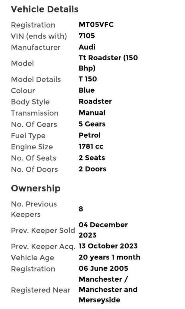 Classic Audi TT Mk1 Convertible*2005 Facelift ulez compliant (Cheaper road tax/insurance)*1800cc 150 BHP Turbo*Manual*Genuine low mileage of only 97,000 miles with a full service history*Recently serviced*New battery*New starter motor*Recently refurbished wheels with new tyres*Mot July 2026 with zero advisories*Cambelt & waterpump changed in 2022*Rare Glacier Blue Pearlescent paintwork (Changes shade in different light)*Electric power dark blue roof*Full Black Leather interior*18 inch Alloy wheels*4 new tyres*Audi Bose Radio/CD*2 keys*Hpi clear*Immaculate condition throughout*Drives lovely*Elderly owner past few years*Genuine reason for sale*Only £3500 or just £3000 cash*Any questions, please message me*No silly offers or timewaster's.