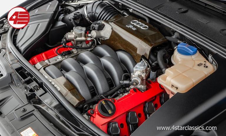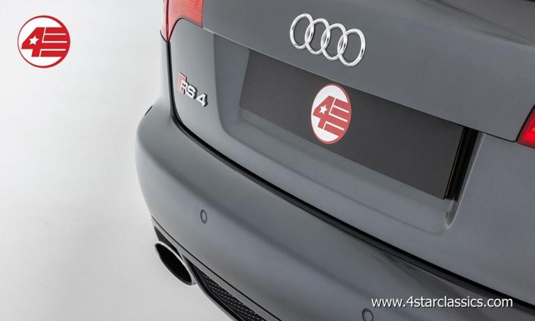 Daytona Grey pearl effect paintwork, Black leather upholstery, 19-inch double-spoke alloy wheels, 6-speed manual transmission, Heated 'wingback' Recaro bucket seats with electric lumbar support, Bose sound system, Front and rear parking sensors, Cruise control, Engine starter button, Matte aluminium mirror casings and roof bars, Carbon fibre interior trim, Aluminium pedals, RS4 sports suspension with variable shock absorption and Dynamic Ride Control (DRC), RS instrument dials, RS Sports flat-bottom steering wheel in anthracite Alcantara, Gear knob and gaiter in anthracite Alcantara, Aluminium RS4 scuff plates, Xenon Plus headlights with daytime-running lights, Headlight-cleaning system, quattro permanent four-wheel-drive, Electric windows, Heated and electrically-operated door mirrors, Rear privacy glass, ISOFIX for rear seats, Audi floor mats, Spare key.
