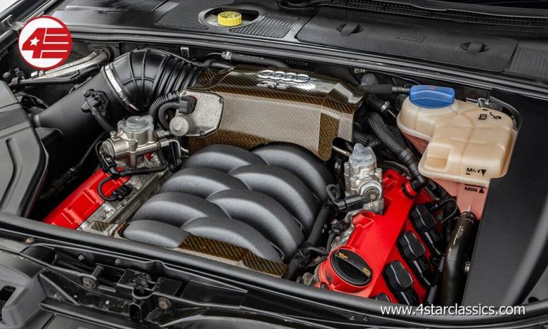 The interior space is incredibly well preserved, and with the high level of spec it's hard to believe that the car is almost 20 years old. The desirable 'wingback' Recaro front seats are in excellent shape with minimal wear including the deep bolsters. The cabin is lifted further with lashings of glossy carbon fibre and immaculate anthracite Alcantara on the gear knob, handbrake lever, and flat-bottom RS steering wheel. The centre console, dash, and switchgear are also excellent with no damage or scratches, and everything works as it should. In the footwells the carpets are perfect with original Audi floor mats still in place.
