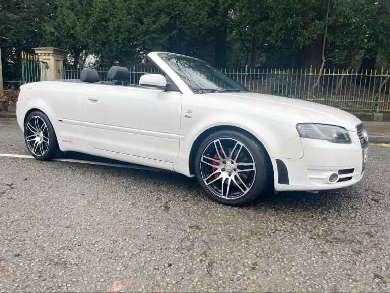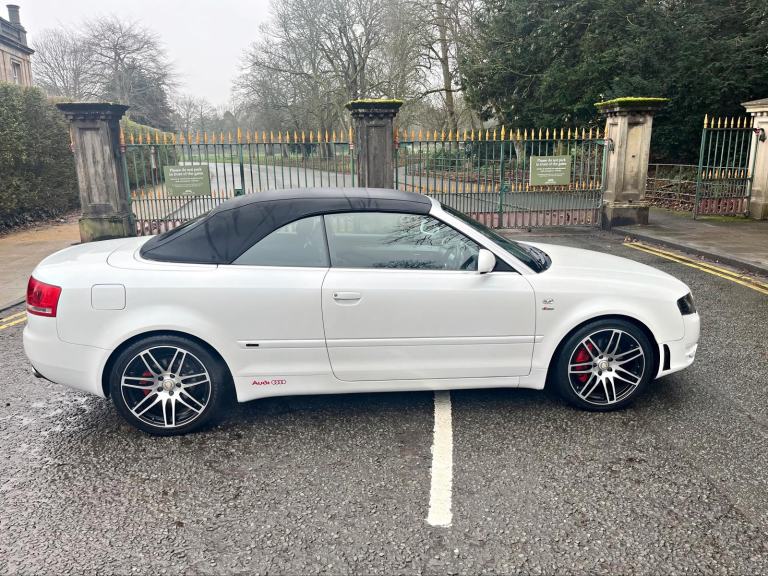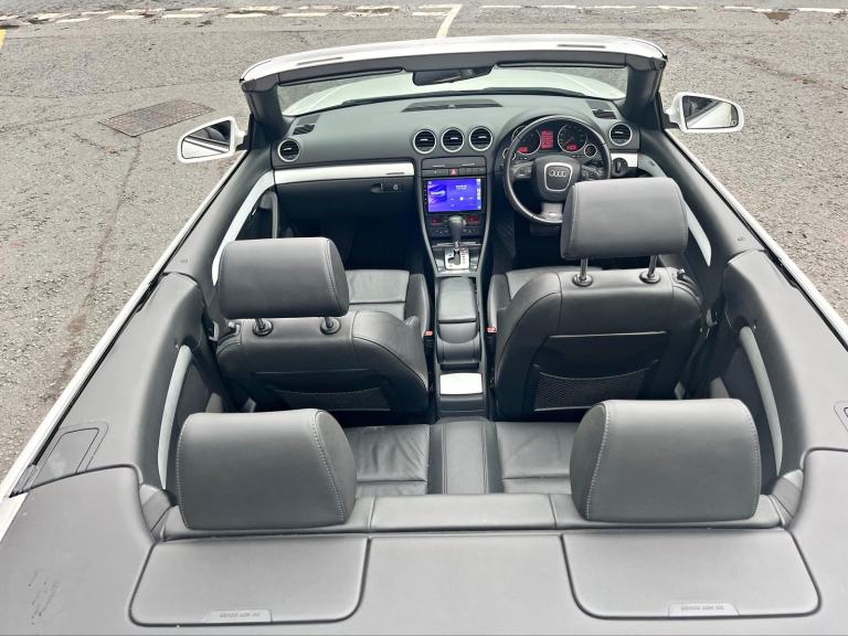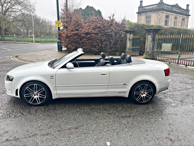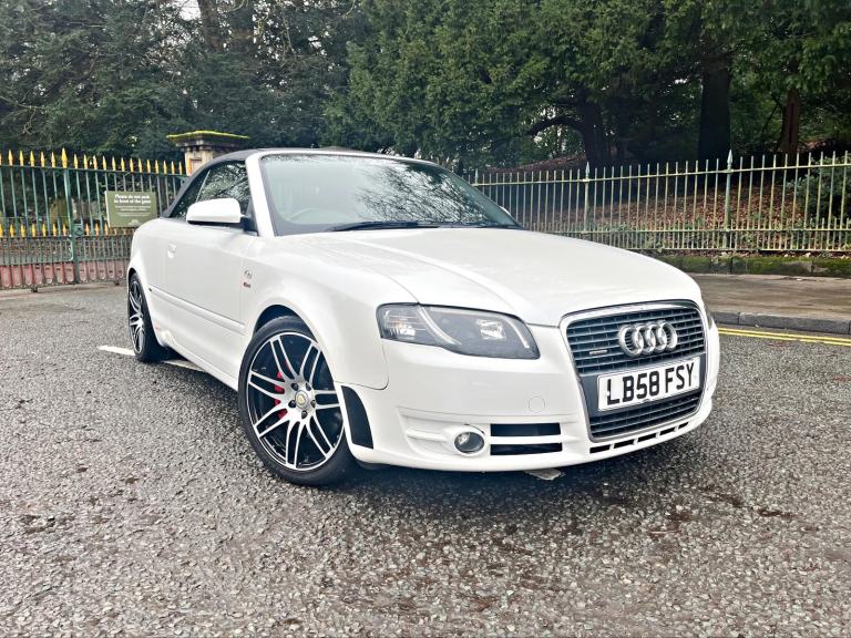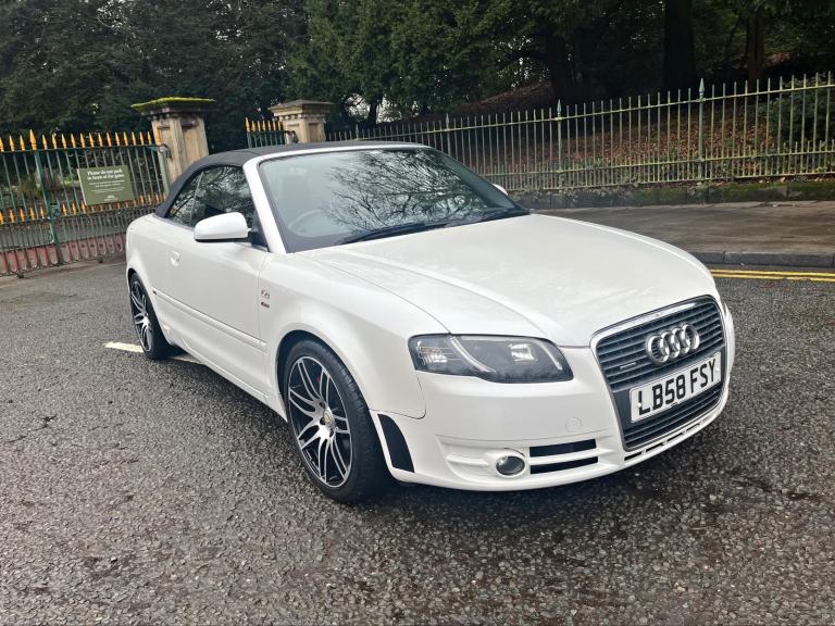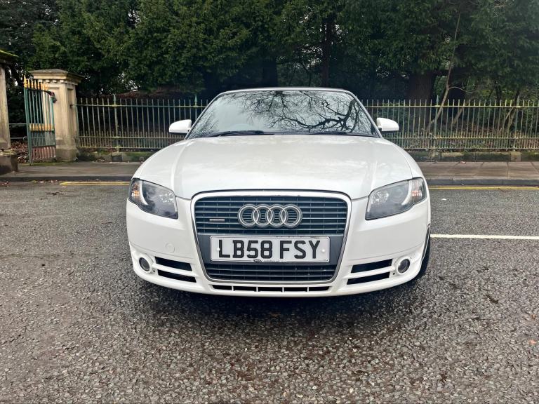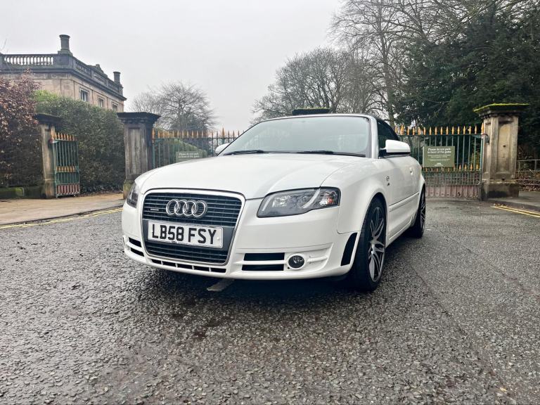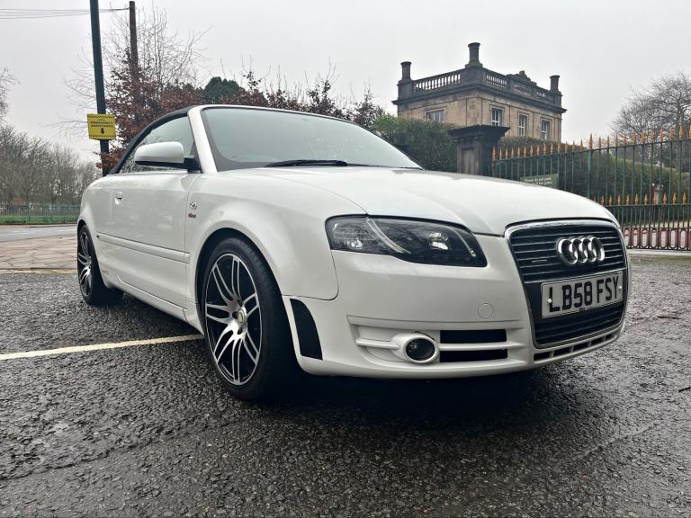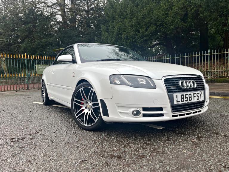 2009/58 Audi A4 2.0 FSI CVT/Auto S/Line Convertible. Finished in Moonstone White Pearl Metallic with Black leather trim. S4 Alloys with excellent Goodyear tyres. Apple Car Play media system with Whatsapp, Spotify etc, remote convertible roof module, electric windows, paddle shift, central locking, full service history, 2 keys, all book packs, last owner for 10 years.