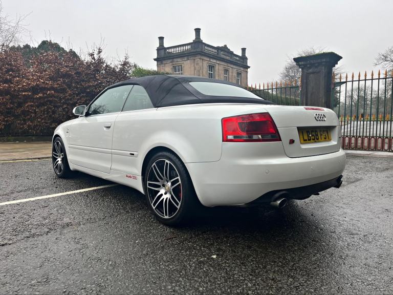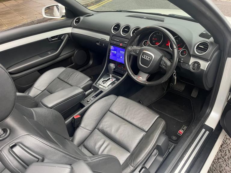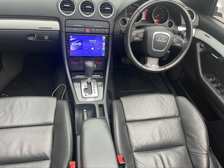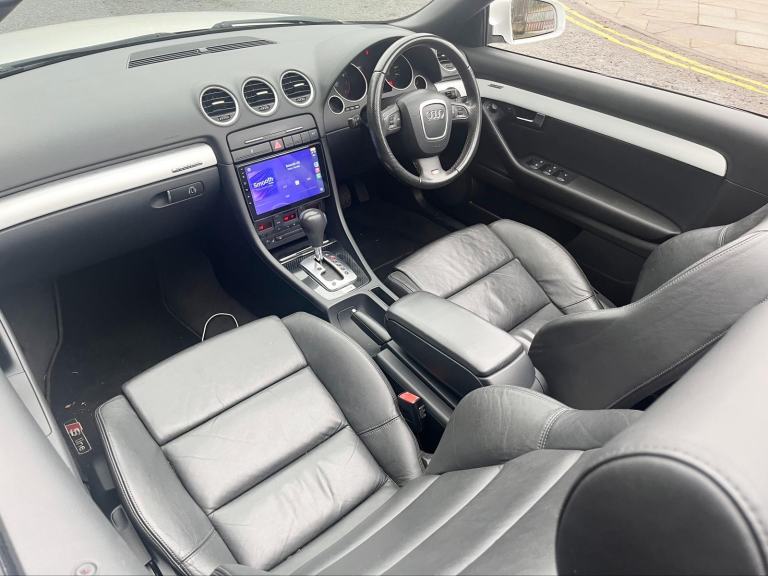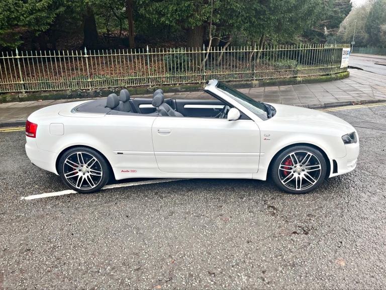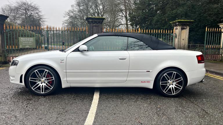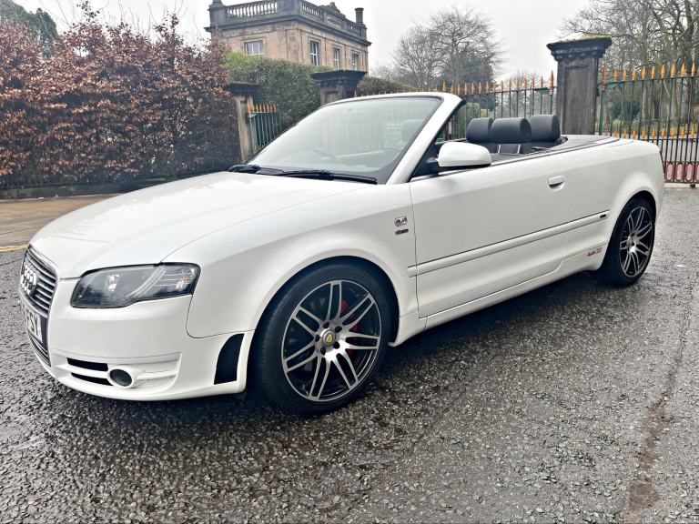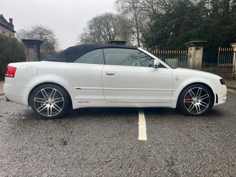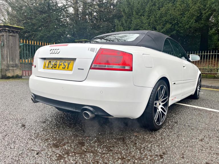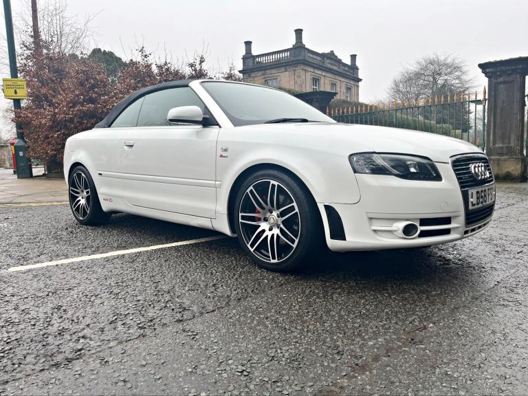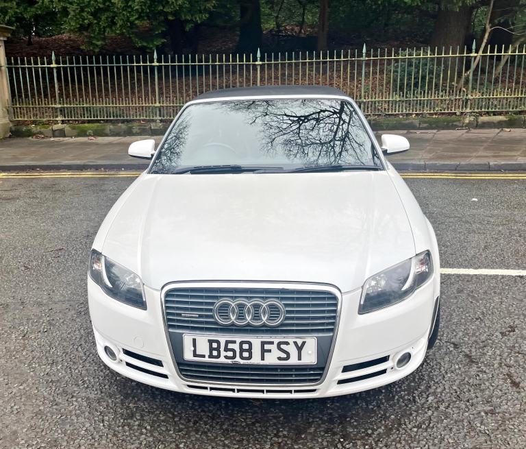 2009/58 Audi A4 2.0 FSI CVT/Auto S/Line Convertible. Finished in Moonstone White Pearl Metallic with Black leather trim. S4 Alloys with excellent Goodyear tyres. Apple Car Play media system with Whatsapp, Spotify etc, remote convertible roof module, electric windows, paddle shift, central locking, full service history, 2 keys, all book packs, last owner for 10 years.