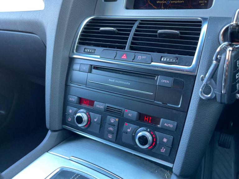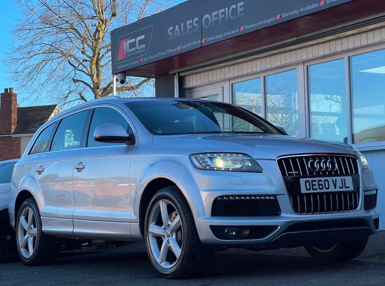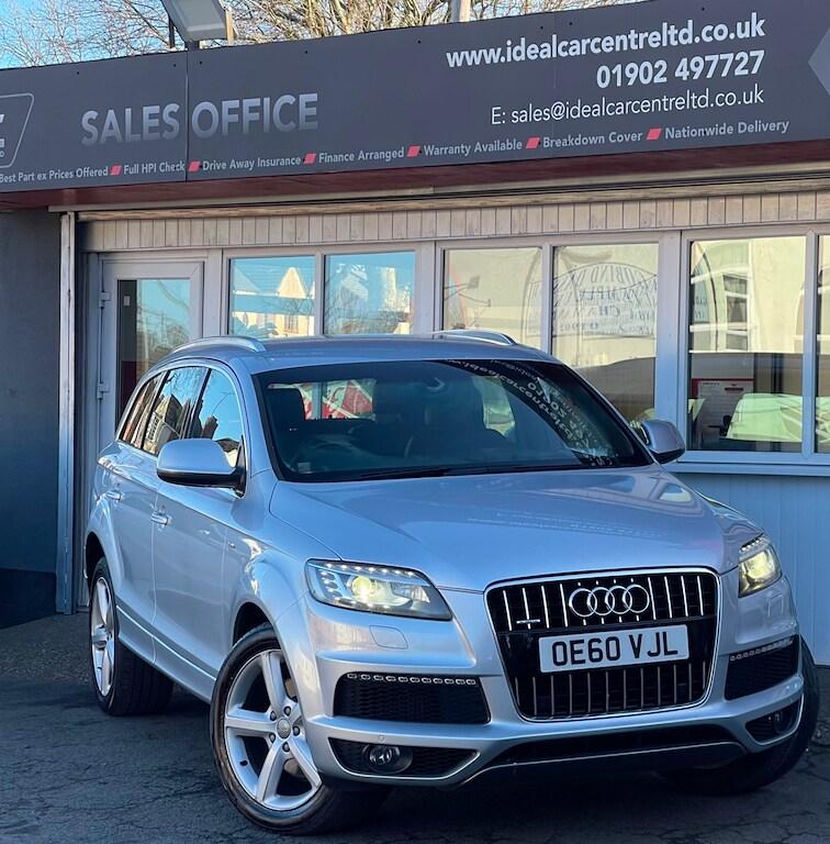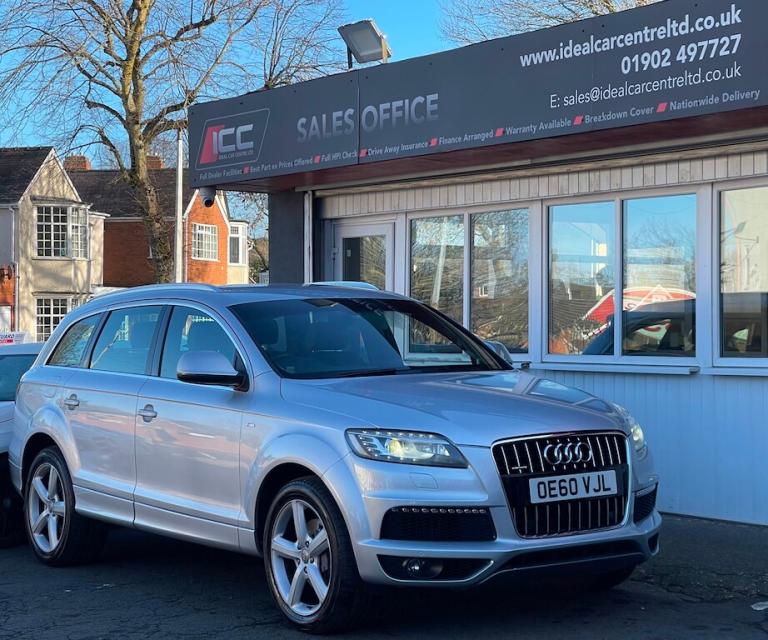 General Vehicle Information Year: 2011 Make: AUDI Model: Q7 TDI V6 Engine Size: 3.0L Transmission: AUTOMATIC Body Style: 5 DOOR SUV Fuel: DIESEL MPG: BHP: Registration: OE60VJL Current Mileage: 95,074 Number of previous owners: 2 Number of keys: 2 V5 Doc: Present MOT Expiration Date: New 12 month MOT Service History: Present SEAT: 7 SEATHS !!! READY TO DRIVE AWAY TODAY !!! Don't let it get away! Hold this vehicle with a fully refundable £99 deposit reserve online or call and speak to our sales manager Vehicle Specification: Top 5 Features: Exterior Spec: Interior Spec: service history: Vehicle Purchase Price: £7,495.00 Full Dealer Facilities Buy with confidence All of our vehicles undergo a comprehensive multi-stage quality and safety assurance inspection, ensuring each vehicle meets our high preparation standards before they go on sale. Every aspect of your vehicle is inspected, including: Vehicle Exterior Bodywork, Vehicle Interior Condition, Brake Discs, Pads, Shoes & Drums, Oil Leaks, Gearbox Operation, Steering, Suspension, Engine Performance, Exhaust Condition, Wheel Balance/Tracking Tyre Depths & Pressures, Electrical Systems, Road Test, Many more. Will also come with a up to date service and new 12 month MOT if required. Buy a car online from the comfort of your home No matter where you are, we’ve made it really easy to buy a car online in 3 simple steps. 1:Choose your car Reserve online for £99 or speak to our contact center you can also request a personalized video. 2:Paperwork and payment made easy Complete your deal online, including part-exchange and any finance. 3:Choose your delivery option Contactless Click & Collect and home delivery available. FOR MORE INFO PLEASE CALL OUR SALES TEAM We are open 6 days a week Monday- Saturday 9:00am till 6:00pm. Appointments only Click and Collect Service Available Open to Inspection and Viewing HPI Checks Done on all Vehicles Nationwide Delivery Available England, Scotland and Wales Extended Warranty Available up to 6,12 or 24 Months Warranty policies to suit our individual needs. Talk to one of our highly trained sales Managers to decide what suits you best. Driveaway Cover Available Part Exchange Available Brake down cover Available For more information please call our office on [Phone number removed] or 01902497727 or visit our website / social media @idealcarcentreltd for more photos and info.. 18in 6Spoke Alloy Wheels,18in Alloy spare Wheel,4Spoke Leather Multifunction Steering Wheel,8 Speakers,Acoustic Parking System- Rear,Aluminium trigon inlay,Black RoofRails,Cruise Control,Delete Row3 Seats,Delete engine designation at Rear,Deletion of model & engine designation at Rear,Drivers information System,Folding Front centre armrest & storage,Front Ashtray & cigar Lighter,Front&Rear floor mats,Inlays- gloss Black,Leather gear knob,MMI- Multi Media Interface Control System,Non smoking Pack,Radio & CD,Reach & rake adjust Steering column,Space saver spare Wheel,Wood inlay- Natural Walnut,Wood inlay- Olive Ash,Wood inlay- Tamo Ash