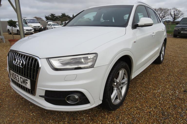 METALLIC ARCTIC WHITE WITH A CONTRASTING HALF LEATHER INTERIOR. A AUDI Q3 TDI QUATTRO IN THE S LINE FORMAT REGISTERED ON 13 12 2013 TO BE SUPPLIED WITH 12 MONTHS MOT. STEADY LOW MILEAGE INCREASES ARE RECORDED VIA THE MOT HISTORY AT GOV.UK ALSO WITH AIR CONDITIONING, DUAL CLIMATE CONTROL, ABS, TRACTION CONTROL, DRIVERS AIR BAG, PASSENGER AIR BAG, ADDITIONAL AIR BAGS, ELECTRIC WINDOWS, ELECTRIC MIRRORS, POWER STEERING, CENTRAL LOCKING, RADIO / CD PLAYER, FRONT FOG LAMPS, ALLOY WHEELS AND THE FACTORY ALARM. JUST ARRIVED.