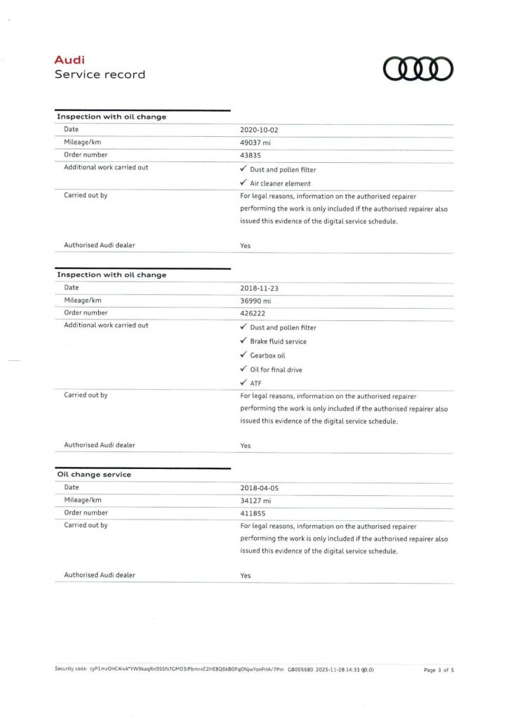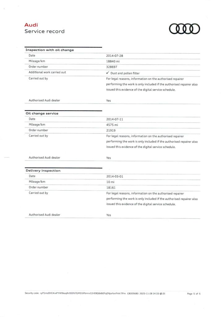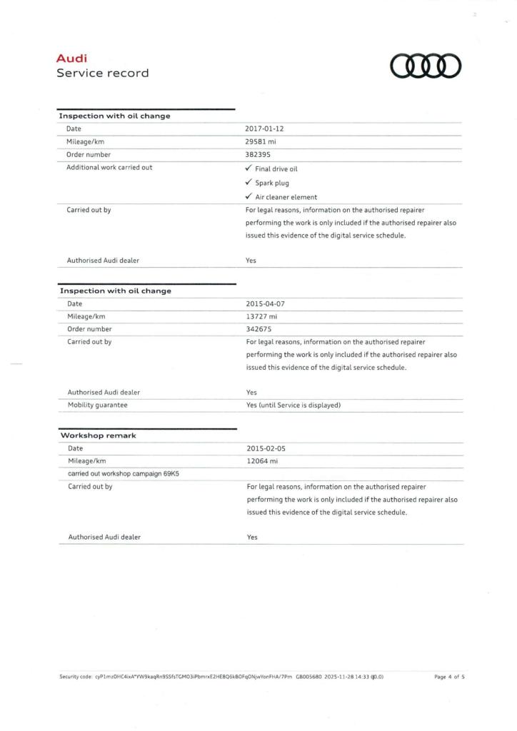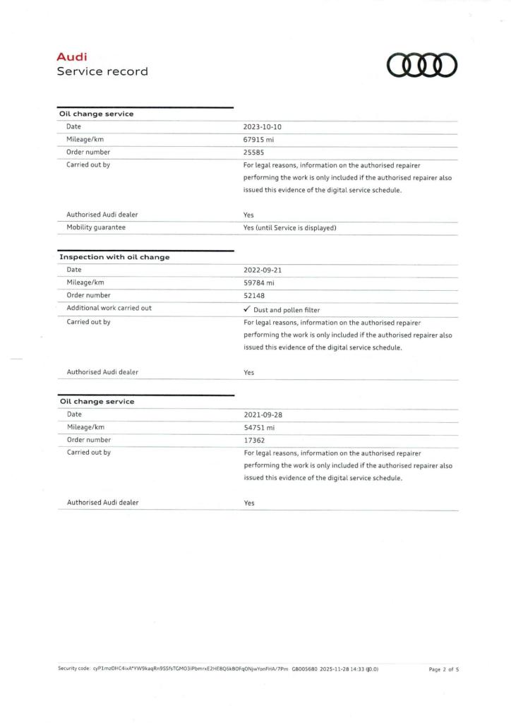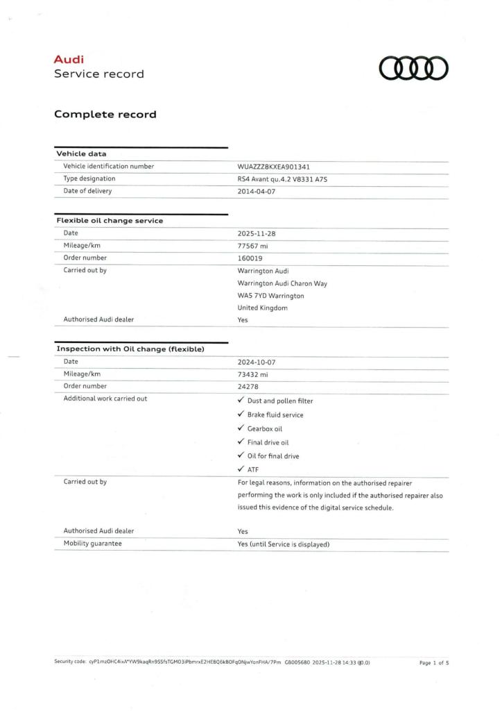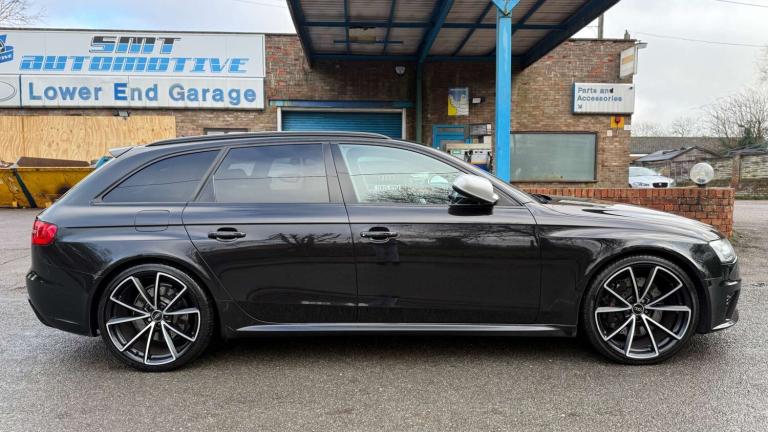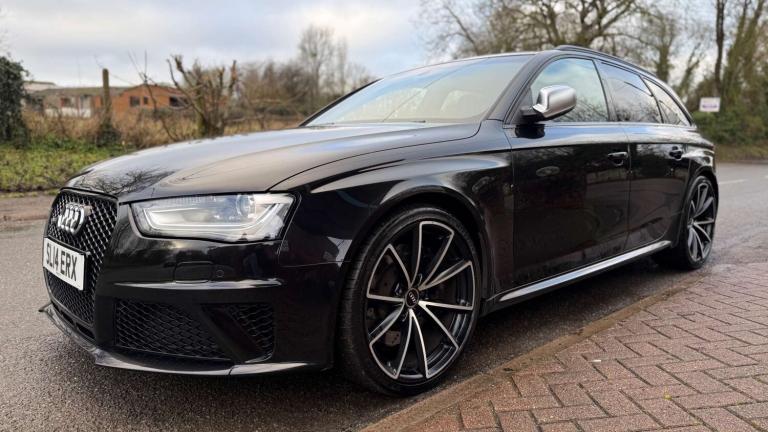 A beautiful Panther Black Crystal Effect Audi RS4 Avant, and what an exceptional example this is. The previous two owners maintained the vehicle under full Audi warranty, meaning no expense has been spared throughout its life. This low-mileage example has covered just 78,000 miles and benefits from a full Audi service history, including all DSG, Haldex, and final drive services carried out at the correct intervals.We have completed a full vehicle health check and replaced the driver’s side upper suspension link arm. The car also comes with an MOT valid until November 2026. This fantastic RS4 is ready to drive away today, with next-day delivery available.03.03.2014 at 10 miles – Pre-delivery inspection carried out by Audi main dealer; 11.07.2014 at 4,575 miles – Oil change service carried out by Audi main dealer; 28.07.2014 at 18,840 miles – Inspection with oil change carried out by Audi main dealer; 07.04.2015 at 13,727 miles – Inspection with oil change carried out by Audi main dealer; 05.04.2018 at 34,127 miles – Oil change service carried out by Audi main dealer; 23.11.2018 at 36,990 miles – Inspection with oil change including brake fluid service, gearbox oil, final drive oil and ATF carried out by Audi main dealer; 02.10.2020 at 49,037 miles – Inspection with oil change including air and pollen filters carried out by Audi main dealer; 28.09.2021 at 54,751 miles – Oil change service carried out by Audi main dealer; 21.09.2022 at 59,784 miles – Inspection with oil change including dust and pollen filter carried out by Audi main dealer; 10.10.2023 at 67,915 miles – Oil change service carried out by Audi main dealer; 07.10.2024 at 73,432 miles – Inspection with oil change (flexible) including brake fluid service, gearbox oil, final drive oil and ATF carried out by Audi main dealer; 28.11.2025 at 77,567 miles – Flexible oil change service carried out by Audi main dealer.20-inch diamond-cut two-tone alloy wheels finished in matte black and aluminium, privacy glass, black styling pack, Audi Advanced Key with keyless entry and keyless start, powered tailgate, front and rear parking sensors, matte chrome wing mirror housings, Audi LED daytime running lights, electric windows front and rear, electrically adjustable heated and folding door mirrors, electrically adjustable seats with lumbar support and memory function, piano black interior inlays with aluminium edging, automatic headlamps and wipers, flat-bottom steering wheel with aluminium paddle shifters and radio controls, wireless Apple CarPlay, wireless Android Auto, wireless MirrorLink, dual climate control, heated seats, CD player, satellite navigation, Bluetooth, DAB radio, Bang & Olufsen sound system, leather armrest, Dynamic Ride Control, RS-embossed bucket seats in Fine Nappa leather finished in black metallic with Rock Grey stitching.We follow a fixed-price policy to maintain clarity, fairness and exceptional standards. By not negotiating on price, we are able to focus on presenting every vehicle in excellent condition for its age and mileage. Each car is meticulously prepared and represents strong value compared to similar models, giving you complete confidence in the quality of what we offer.Every vehicle includes a new MOT (if under 6 months remain), a full service (if due within 5 months or 5,000 miles), a timing belt kit replacement where required, an HPI check with certificate, and a 6-month parts and labour warranty. Our warranty provides full labour-rate cover, including main dealer labour rates, and a claim limit equal to the full value of the car for maximum protection. You can also extend this cover to 12, 24 or 36 months through Warranty Solutions Group.For added convenience, we offer virtual live video viewings so you can explore the car from home. During the appointment we can show you all paperwork, keys and features, and answer any questions. Nationwide delivery is also available, bringing your chosen vehicle directly to your door.