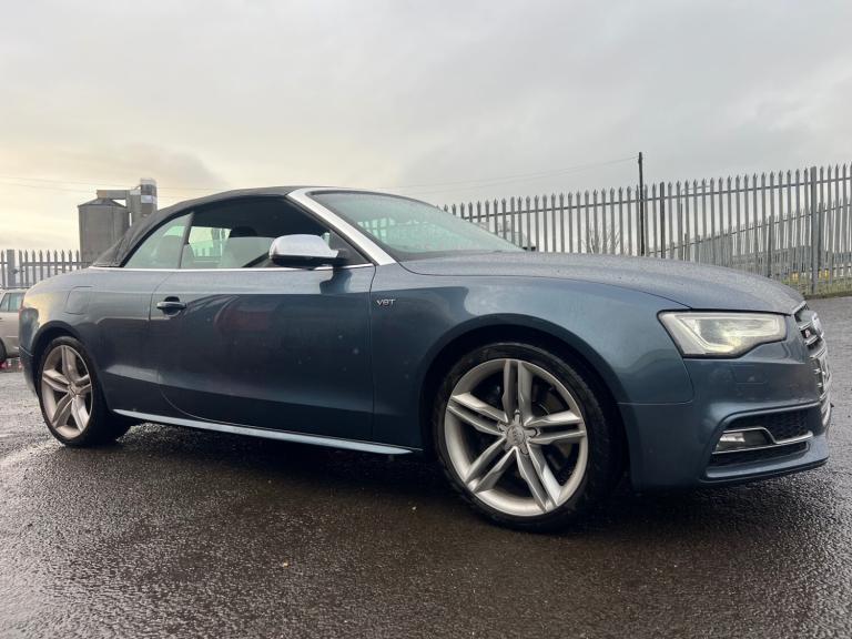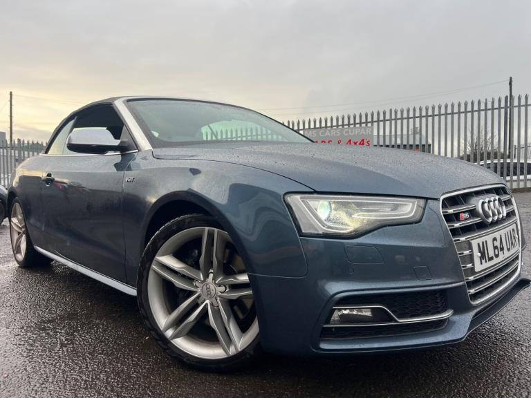 2014 64 AUDI A5 S5 3.0 V6 QUATTRO CONVERTIBLE AUTOMATIC TRONIC 72,000 MILES F/S/H/MATALIC BLUE,SAT NAV,REVERSE CAMERA,FRONT CAMERA,FRONT AND BACK SENSERS,FULL LEATHER INTERIOR/WIRELESS CHARGER/2 X KEYS/, 3rd brake light, Anti-lock Brake System (ABS), Electronic Stability Program (ESP), One touch indicator, Power assisted brakes, Rear cross traffic camera,WIRELESS CHARGER/tyer pressure monitor, Hands-free Bluetooth system, Telephone, Autopilot function, Check control system, Configurable dashboard display, Cruise control, Navigation system, Service interval indicator, Steering wheel audio controls, Steering wheel with cruise control operation, Tool kit, Travel data recorder, Trip computer, Power Assisted Steering, Rev counter, Traction control, Auxiliary input socket, Digital radio, Radio/CD, USB input, Body coloured bumpers, Rear boot, Roof rails, Daytime running lights, Front fog lights, LED daytime running lights, Air conditioning, Front centre armrest, Front head restraints, Front interior 12V power outlet, Rear headrests, Steering wheel manually adjustable, Steering wheel rake adjustment, Steering wheel reach adjustment, Leather gear selector trim, Leather handbrake trim, Leather interior door trim, Leather steering wheel, Rear park assist camera, Rear parking sensor, 3x3 point rear seat belts, Active front head restraints, Drivers airbag, Isofix child seat anchor points, Manual child proof locks, Passenger airbag, Height adjustable drivers seat, Lumbar support, Alarm, Central locking, Immobiliser, Remote central locking, Cloth/Leather seat upholstery, Alloy wheels, Spare wheel, Front electric windows, Privacy glass, Rear electric windows, Rear wiper/only 72,000 miles f/s/h/comes with 12 month mot and full engine service/6 months warranty/finance available,delivery can be arranged/buy with confidence,read our 5 star reviews,ms car sales Cupar ky154rd