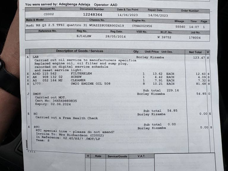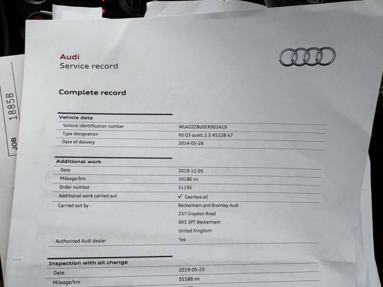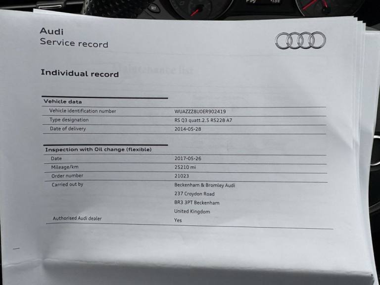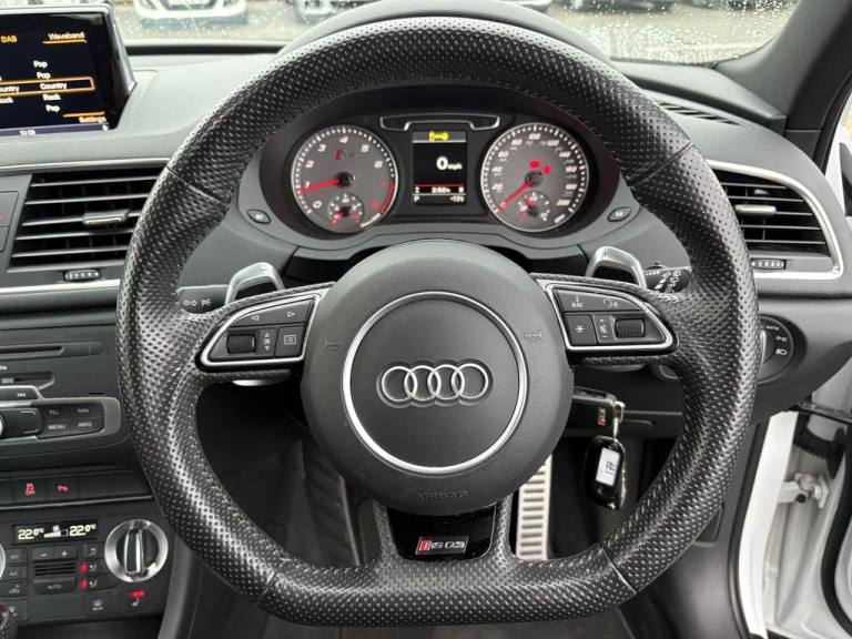 With only two owners and a remarkably low mileage of 68,577 miles for its 2014 registration, this Audi RS Q3 TFSI presents a compelling proposition. Powered by a potent 2.5 litre petrol engine and featuring Audis renowned four wheel drive system, this performance SUV offers an engaging driving experience. Comfort and convenience are enhanced by dual zone electronic climate control, heated front seats, and the Audi Parking System Plus with front and rear sensors. Stay connected on the go with the Bluetooth interface for mobile telephone preparation, and experience superior illumination with the Bi-Xenon Plus headlights. This RS Q3 is also ready for the road, with its MOT valid until July 2026. The performance of this Audi RS Q3 TFSI truly sets it apart, boasting an impressive 0-60mph acceleration time of just 5.5 seconds. This swift acceleration indicates a level of dynamic capability that surpasses many other vehicles in its class. Combined with its sophisticated all wheel drive system and the powerful 2.5 litre engine, this RS Q3 delivers a driving experience that is both exhilarating and assured, making it a standout choice for those seeking both practicality and performance..Glacier White, 12V Power Socket, 12V Power Socket - Rear, 20in Alloy Wheels - 5-Twin-Spoke V Design, 50 Station Memory with Dynamic Station List, 6.5in Display Screen, ABS - Anti-Lock Braking System, AMI - Audi Music Interface, ASR - Anti Slip Regulation, Air Quality Sensor, Airbags - Driver, Airbags - Front Passenger, Airbags - Front Side, Airbags - Head System, Alarm - Thatcham Category 1, Aluminium Look Pedals, Aluminium-Effect Door Mirror Housings, Amplifier - 180 Watt, Anti Theft Locking Wheel Bolts, Ashtray, Audi Drive Select, Audi Parking System Plus, Audi Sound System, Brake Calipers - High-Gloss Black with RS Logo, Brake Lights - LED, Car Jack, Child Locks - Electric, Cloth Headlining in Black, Colour Drivers Information System - DIS, Concert Radio, Cup Holders - x2 in Centre Console, Door Mirrors - Electrically Adjustable and Heated, Door Sill Trims - with Aluminium Insert and RSQ3 Logo, Dual-Zone Electronic Climate Control, EBD - Electronic Brakeforce Distribution, EDL - Electronic Differential Lock, ESP - Electronic Stability Programme, Electric Windows - Front and Rear, Electrically Adjustable 4-Way Lumbar Support, Electromechanical Parking Brake, Electromechanical Power Steering, Exhaust Tailpipe - Sports Exhaust System/Chrome Rolled Finish x4, First Aid Kit, Front Centre Armrest, Front Passenger Airbag Deactivation Switch, Front Sports Seats, Full Body Colour Paint Finish, Funnel-Shaped Air Intake Frame - Body Colour, Funnel-Shaped Air Intake Frame - High Gloss Black, Gear Knob - Perforated Leather with RS Selector Logo, Glovebox - Illuminated, Headlights - Automatic Dynamic Range Control, Headlights - Bi-Xenon Plus, Headlights - Coming-Leaving Home Function, Headlights Washers, Heated Front Seats, Heated Windscreen Washer Jets, Hydraulic Brake Assist, ISOFIX Child Seat Mounting for Front Passenger, ISOFIX Child Seat Preparation for Rear Seats with Top Tether, Immobiliser, Inlays - Aluminium Race Design, Interior Lighting, LED Daytime Running Lights, LED Rear Indicators, LED Rear Lights, Light and Rain Sensor Package, Matt Aluminium Styling Package, Mobile Telephone Preparation - Bluetooth Interface, Preparation for SD Card-Based Navigation System, RS Body Styling, RS Logo and One-Piece Trim Frame in Matt Aluminium Look, RS Sports Suspension, Radiator Grille - Single Frame - Honeycomb Design Grid in High Gloss Black, Radiator Grille Frame - Matt Aluminium look, Radiator Grille and Frame - High Gloss Black, Remote Audio Control, Remote Centra
