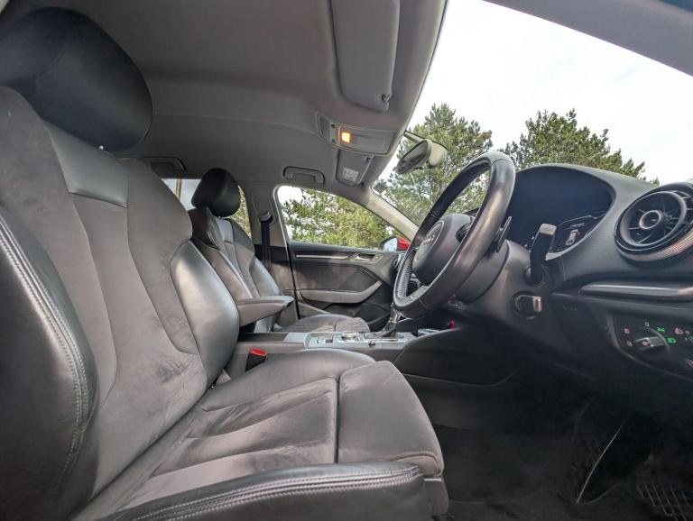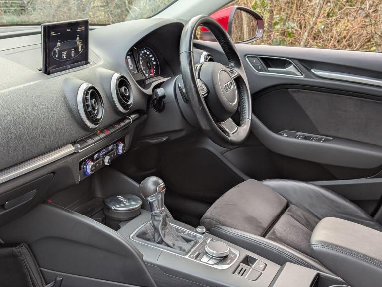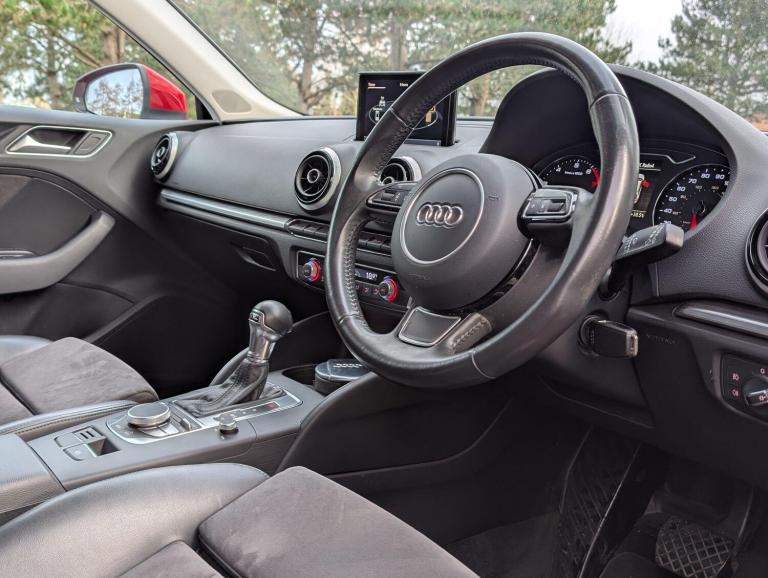 Audi A3 Automatic finished in the standout Misano Red Pearl Effect. This is an exceptional one owner from new example with just 35k miles, and quite possibly one of the finest examples of this age and specification currently available. Clearly garaged from new, the condition throughout is outstanding and must be seen to be fully appreciated. With such low mileage and single ownership, it represents a rare opportunity to acquire a genuinely well cared for Audi A3.The interior is finished in a premium leather & Alcantara upholstery with contrasting stitching, offering an excellent colour combination that complements the exterior perfectly. Specification includes satellite navigation displayed on Audis large infotainment screen, DAB radio, Bluetooth phone and audio connectivity, front and rear parking sensors, air conditioning, Audi Drive Select with Comfort, Auto and Sport modes, auto stop/start with on off option, centre armrest, electric windows and mirrors, and a smooth automatic gearbox delivering refined everyday driving.Owned by the same keeper from new and maintained to a very high standard, the car benefits from a full service history with over 10 services carried out, most recently in March 2025 by an Audi specialist, including the cambelt replacement. It has recently had a new battery fitted and will be supplied with a new MOT. Powered by Audis highly regarded 1.4 TFSI engine producing 148 bhp, it offers strong performance while still returning up to 60 mpg, with only 20 annual road tax and low insurance costs. Supplied with two keys, locking wheel nuts and a space saver spare wheel. The Audi A3 was awarded 2014 World Car of the Year, reinforcing its class-leading reputation. Includes a free 3-month warranty, and part exchange is welcome. Contact us today to arrange your viewing and test drive. Walkaround video available on request.