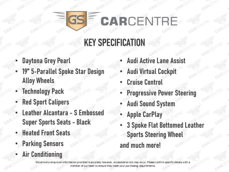 GS Car Centre are excited to bring to market this stunning Audi TTS 2.0 TFSI S Tronic quattro Euro 6. Please see below some of the key features, service, warranty and finance information;Key Specifications:- Daytona Grey Pearl- 19in 5-Parallel Spoke Star Design Alloy Wheels- Technology Pack- Red Sport Calipers- Leather Alcantara - S Embossed Super Sports Seats - Black- Heated Front Seats- Parking Sensors- Air Conditioning- Audi Active Lane Assist- Audi Virtual Cockpit- 12.3in High Resolution LCD Display- Cruise Control- Progressive Power Steering- Audi Sound System- Apple CarPlay- Bluetooth Audio- 3 Spoke Flat Bottomed Leather Sports Steering WheelService History:- 9 Services (5 Main Dealer, 3 Independent - 1 to be added)Warranty:- 3 months as standard- 1 year warranty £598, £5,000 per claim, unlimited claims- 2 year warranty £998, £5,000 per claim, unlimited claims- 3 year warranty £1198, £5,000 per claim, unlimited claimsFinance:- Finance available from 9.9% APRKeys: 2Registration: NG15 XAS
