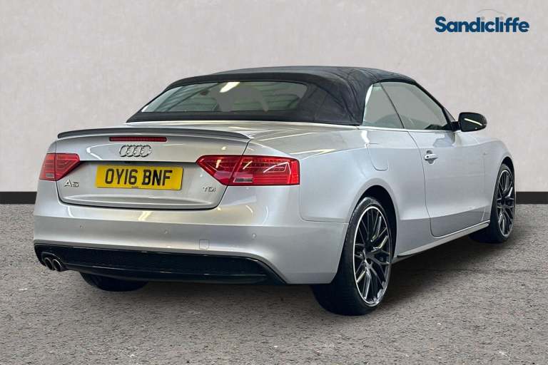 This 2016 Audi A5 Cabriolet TDI S line Special Edition Plus boasts exceptionally low mileage for its age, having covered just 48221 miles. As a Euro 6 compliant model, it features a 2.0 litre diesel engine, offering a blend of efficiency and performance. The S line Special Edition Plus trim signifies a well appointed vehicle, and you'll appreciate the generous boot space, making it practical for everyday use and longer journeys alike. This exceptional vehicle boasts a wealth of premium features, including Satellite Navigation, Bluetooth, Front & Rear Parking Sensors, Rear Parking Camera, Bang & Olufsen Sound System.The performance of this A5 Cabriolet is notable, with an acceleration of 0 to 60 miles per hour achieved in a brisk 8.0 seconds. This figure demonstrates its capability compared to other vehicles in its class. The combination of its refined diesel engine, the sporty S line styling, and the open top driving experience makes this Audi A5 Cabriolet a compelling choice for those seeking both style and substance.At Sandicliffe, we’re proud to be a family-owned business that’s been supporting motorists across the East Midlands for over 75 years representing BYD, Ford, Mazda and MG. Our commitment to quality, care, and community means you can buy with complete confidence, our technicians are highly qualified ensuring that our vehicles are meticulously prepared and maintained. Additionally, we offer a minimum 6-month MOT for added assurance. This car is Located at our Loughborough siteDerby RoadLoughboroughLE115HN