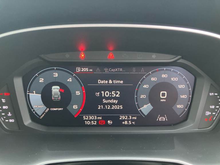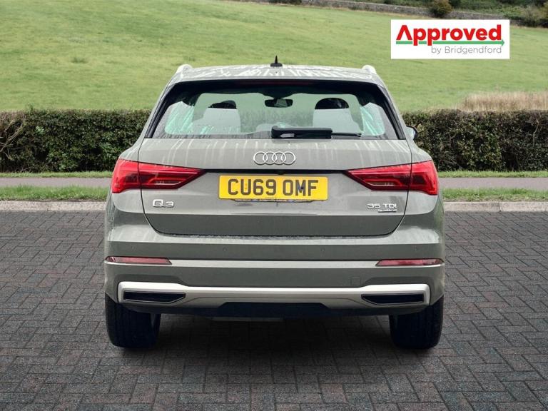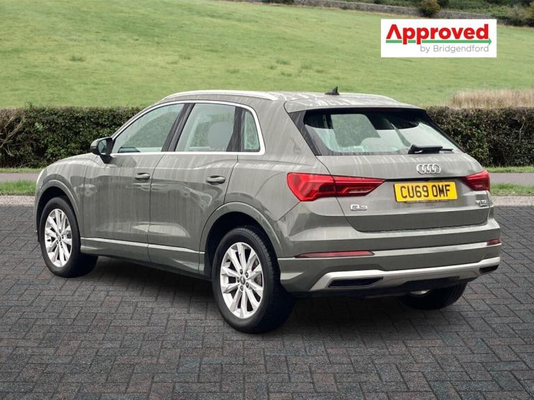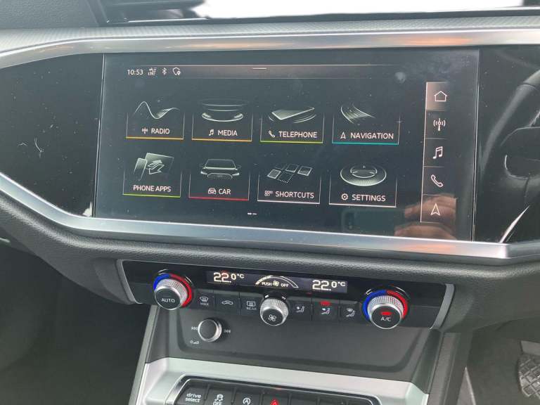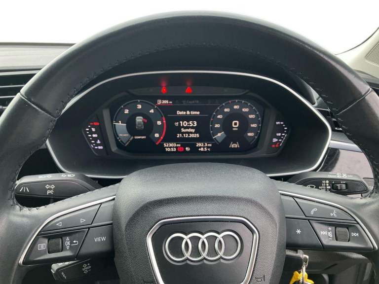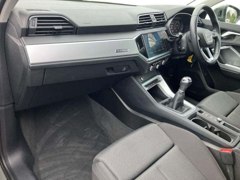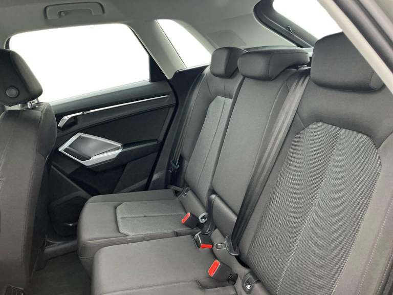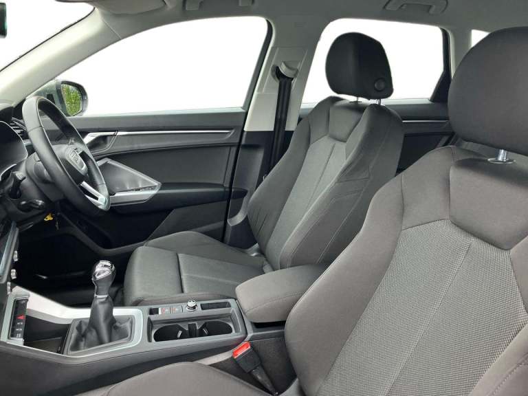 ..Audi connect safety and service (e-call), Audi drive select, Audi lane departure warning, Audi side assist, Audi smartphone interface, Audi Virtual Cockpit - 10.25'' display, Bluetooth interface, Camera based traffic sign recognition, Cruise control + speed limiter, MMI navigation plus with MMI touch, Power opening/closing tailgate, Progressive steering, Rear parking sensors, Service interval indicator, Stop/start system, Voice control system, Diesel particulate filter, Standard suspension, 1 x USB type C and 1 USB type A charging points, 6 speakers, DAB digital radio module, Acoustic windscreen, Aluminium roof rails, Aluminium window trim, Auto dimming rear view mirror, Body coloured bumpers, Electrically adjustable and heated door mirrors with integrated LED side indicators, Front and rear electric windows, Front fog lights, Front side air inlets in matt selenite silver, Front spoiler in matt selenite silver, Grille vertical bars in aluminium silver/Matt, High gloss black finish B and C pillars, LED headlights with LED daytime running lights and dynamic rear indicator, LED rear lights, Rain and light sensors, Rear diffuser strip in selenite silver, Titanium black radiator grille, 12V socket in rear centre console, 40:20:40 split folding rear bench seat, Adjustable rear seat bench/backrest, Aluminium door sill trims, Dual zone climate control, Front and rear headrests, Front and rear roof module including reading lights, Front and rear velour floor mats, Front centre armrest with storage compartment and angle adjustment, Glove compartment lighting, Height and reach adjustable steering wheel, ISOFIX child seat mounting and Top Tether with front passenger airbag deactivation, Luggage compartment light, Lunar silver cloth headlining, Manual front seats with height adjustment, Stainless steel luggage compartment sill finisher, Non smoking pack - Q3, 3x3 point rear seatbelts, 6 airbags - Driver, front passenger, curtain and side windows, Audi pre-sense front with pedestrain and cyclist recognition, Electrically operated child locks on rear doors, Electromechanical parking brake, Electronic stabilisation control including ABS, ASR and EDL, Hill descent control, Hill hold assist, Pre sense basic, Seatbelt monitoring, Tyre pressure warning, Warning triangle and first aid kit, Anti theft alarm, Anti theft wheel bolts, Remote central locking, MMI touch colour display in gloss black with aluminium surround