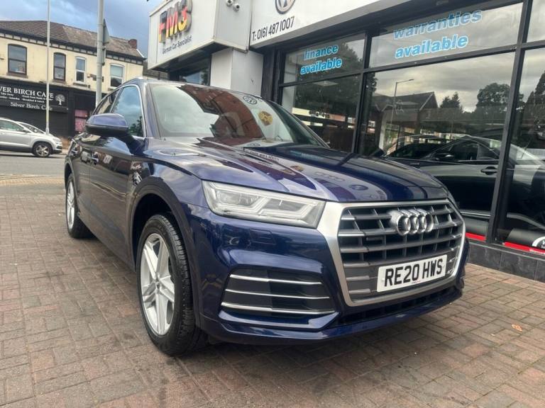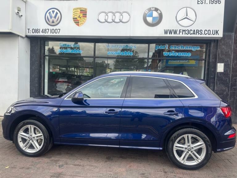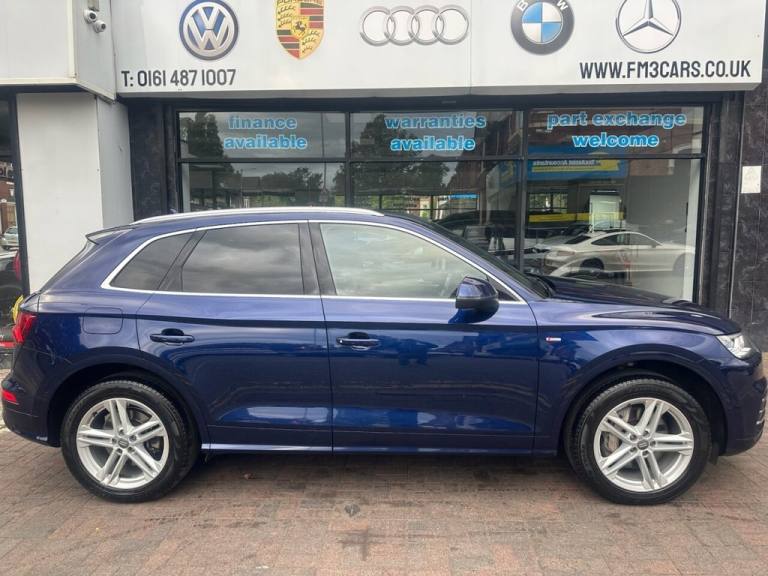 WE AT FM3 CARS WOULD LIKE TO OFFER YOU ANOTHER EXCELLENT AUDI Q5 2.0 TFSIe S LINE SUV 5 Door, Petrol Plug-in Hybrid S Tronic Quattro, Euro 6 (s/s) 14.1kWH (299 ps), Finished in Metallic BLUE With Black Leather/Alcantara Interior, Front Sport Seats, LED Headlight, 2 Keys, Service History, Dual Zone Climate Control, 1 Owner, SAT NAV, Audi Multimedia, Bluetooth, DAB, Radio, 19" Alloys, Privacy Glass, Audi Virtual Cockpit, Excellent Drive, Great looking car, Uk Main Land Delivery and Finance Options Available, Reserve this car today with £199 deposit. All of our cars come provided with a service and MOT. HPI reports are available for all vehicles. Warranties available, subject to suit each individual vehicle. We partner with a wide variety of finance companies, decisions can be made within 60 seconds. Drive your dream car away within 1hour. 5 day drive away insurance available at an additional cost. All part exchanges welcome. Tel; 0161 487 1007. We do take great care in describing the vehicle, its features and history, but errors can be made. Please feel free to ask the sales staff for any particular feature or detail you are not sure about before purchase, as this can not be rectified after purchase. .19in Alloy Wheels - 5-Twin-Spoke Star Design - Diamond Cut Finish, 2 x SDXC Card Readers, 2 x USB Charging Ports and 1 x AUX-IN, 3 Pin 10amp Domestic Charging Cable, 4-Way Electric Lumbar Support, 6-Airbag System, Air Inlets in Matt Titanium Black with Blades in Matt Aluminium Silver, Aluminium Roof Rails, Anti Theft Locking Wheel Bolts, Anti-Theft Alarm, Audi Connect Infotainment Services - 3 Month Trial, Audi Connect Safety and Service - e-call, Audi Drive Select, Audi Parking System Plus, Audi Pre-Sense City, Audi Smartphone Interface, Auto-Dimming Rear-View Mirror, Automatic Headlight Adjustment, Bluetooth Interface, Body Coloured Door Mirrors, CD Drive, Chrome-Plated Exhaust Trim, Cloth Headlining in Black, Colour Drivers Information System with 7in Display, Contrast Stitching on Seats - Steering Wheel and Gear Lever Gaiter, Cruise Control with Speed Limiter, DAB Digital Radio, Deluxe 3-Zone Climate Control, Door Mirrors - Electrically Folding and Heated, Door Sill Trims with Aluminium Inlays, Dynamic Suspension, ESC - Electronic Stabilisation Control inc ABS - ASR and EDL, Electric Windows - Front, Electromechanical Parking Brake, Electromechanical Power Steering, First Aid Kit and Warning Triangle, Front Centre Armrest, Front Sports Seats with S Embossed Logo, Front and Rear Floor Mats, Gear Lever Knob in Black Perforated Leather, Headlights - High-Beam Assist, Heated Front Seats, High Multi-function 3-Spoke Leather Steering Wheel with Grips in Perforated Leather and S Badging with Gear-Shift Paddles, High-Gloss Package, Hill Descent Control, Hill Hold Assist, ISOFIX Child Seat Mounting and Top Tether, Illuminated Door Sill Trims with S Logo, Inlays - Matt Brushed Aluminium, Keyless Go, LED Headlights with LED Rear Lights and Dynamic Rear Indicators, LED Interior Lighting Pack, Light and Rain Sensor, MMI Navigation, MMI Radio Plus with 7in Colour MMI Screen, Manual Seat Adjustment, Multi Collision Brake Assist, Pop-Up Bonnet for Pedestrian Protection, Power Operated Tailgate, Privacy Glass - Rear and Rear-Side Windows, Radiator Grille in Matt Twilight Grey with Horizontal Matt Aluminium Struts, Rear Bench Seat Plus, Rear Diffuser in Body Colour with Matt Aluminium Silver Surrounds, Removable Luggage Compartment Floor, S Line Badges on the Front Wing Panels, S Line Front and Rear Bumpers, S Line Side Skirts, Seat Belt Monitoring, Stainless Steel Loading Sill Protector, Sun Visors - with Vanity Mirror, Tool Kit, Tow Bar Preparation, Trunk Roller Cover