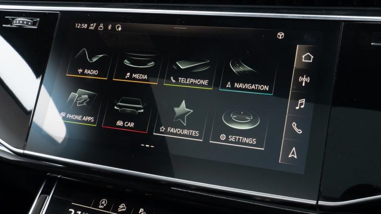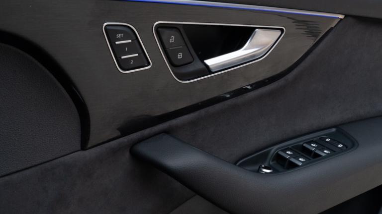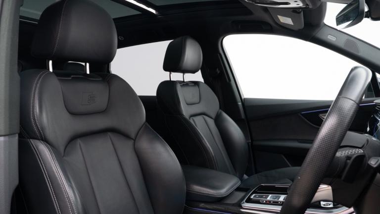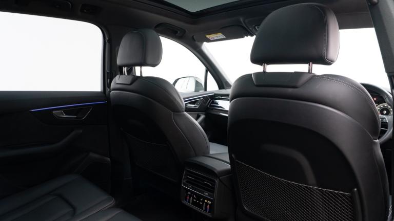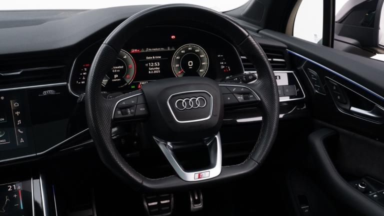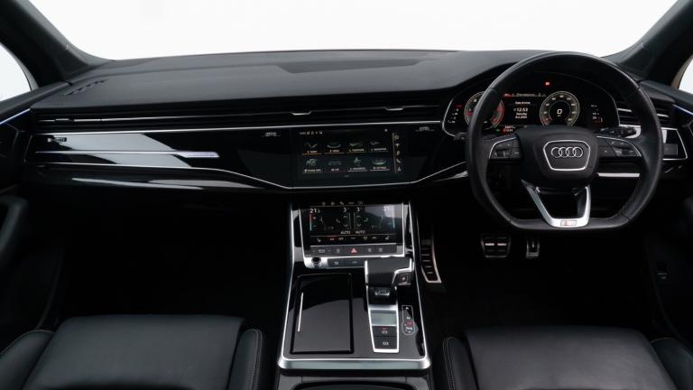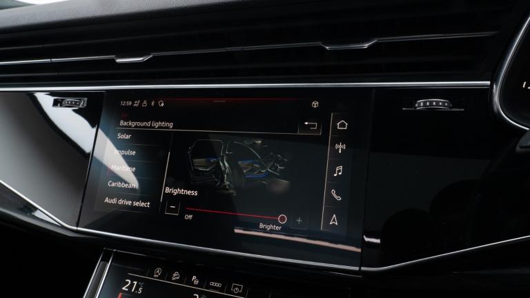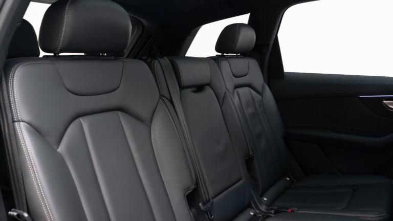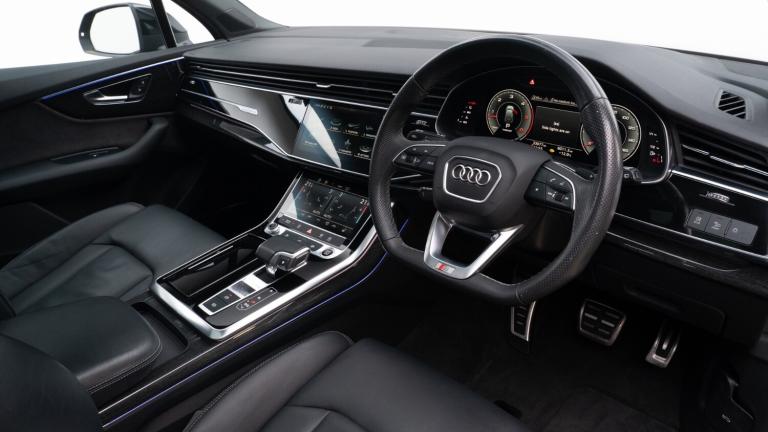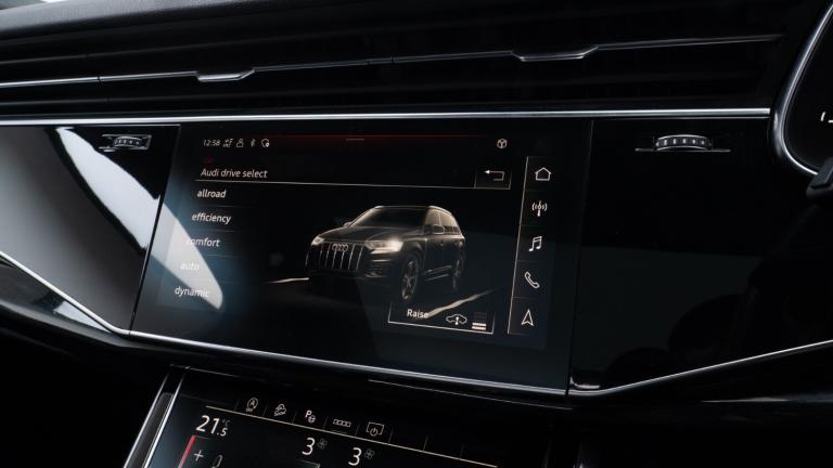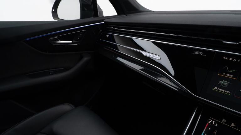 ..Audi connect safety and service (e-call),Audi drive select (Auto, Comfort, Dynamic, Efficiency, Individual, Off-road and All road),Audi phone box with wireless charging,Audi smartphone interface includes wireless Apple carplay/Android Auto,Camera based traffic sign recognition,Electromechanical steering,MMI navigation plus with MMI touch screens includes 10.1'' and 8.6'' screens with haptic feedback,Natural voice recognition,Parking system plus - front + rear sensors,Power operated tailgate,Rear view camera,Start/stop system,48V Mild hybrid technology,Adaptive air sports suspension,Quattro all wheel drive with self locking centre differential,Audi music interface - front 2 USB-C ports with charger and data functions,Audi sound system with 6 channel amplifier, 180 watt amplifying capacity and 10 loudspeakers including subwoofer,DAB digital radio module,Audi matrix LED headlights with dynamic front and rear indicators,Auto dimming frameless rear view mirror,Black roof rails,Bumpers in contrast paint scandium grey finish includes door trim and wheel arch trim strips, inlays in door strip contain quattro embossing,Electrically adj heated/folding + automatically dimming exterior mirrors with memory + automatic kerb side function for passenger side exterior mirror,Heat insulating glass in windshield,Integrated LED indications in door mirrors,LED daytime running lights,LED rear tail lights,Privacy glass - dark tinted rear and rear side windows from B-pillar backwards,4 zone deluxe automatic climate control,7 seat layout with ISOFIX points for the front passenger seat and rear passenger seat,Black cloth headlining,Comfort front centre armrest,Folding rear seats,Front head restraints,Front/rear floor mats,Heated front seats,LED interior ambient lighting,Luggage compartment cover,Luggage compartment sill protection in stainless steel,Rear head restraints,Stainless steel pedals,Sunvisors with illuminated vanity mirrors,Titanium black styling pack - Q7/SQ7,3 point seatbelts on all rear seats,Audi pre sense front,Driver and front passenger, front side and curtain airbags,Electromechanical parking brake,Electronic Stabilisation Control (ESC) including ABS, ASR and EDL,Extended pedestrian protection measures,Hill hold assist,Seatbelt monitoring,Tyre pressure loss indicator,Warning triangle and first aid kit,Anti theft alarm,Anti-theft wheel bolts and wheel loosening detection,Keyless go with remote central locking,Polished oak trim with grey finish inlay,Tool kit,Tyre