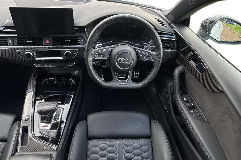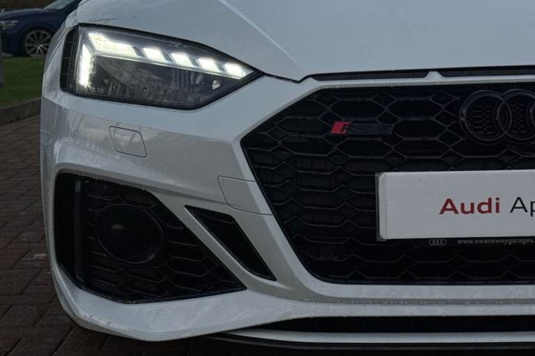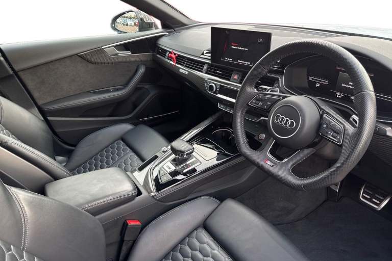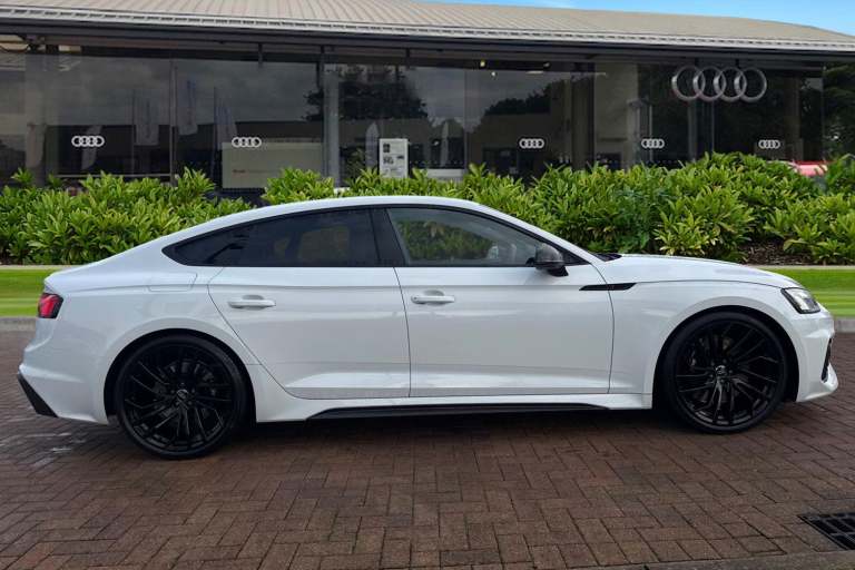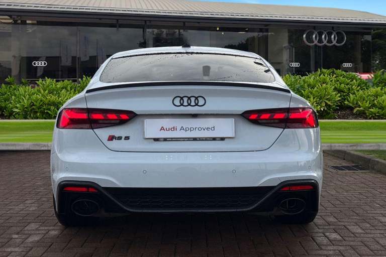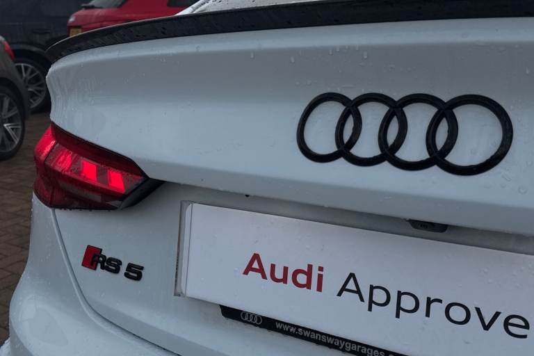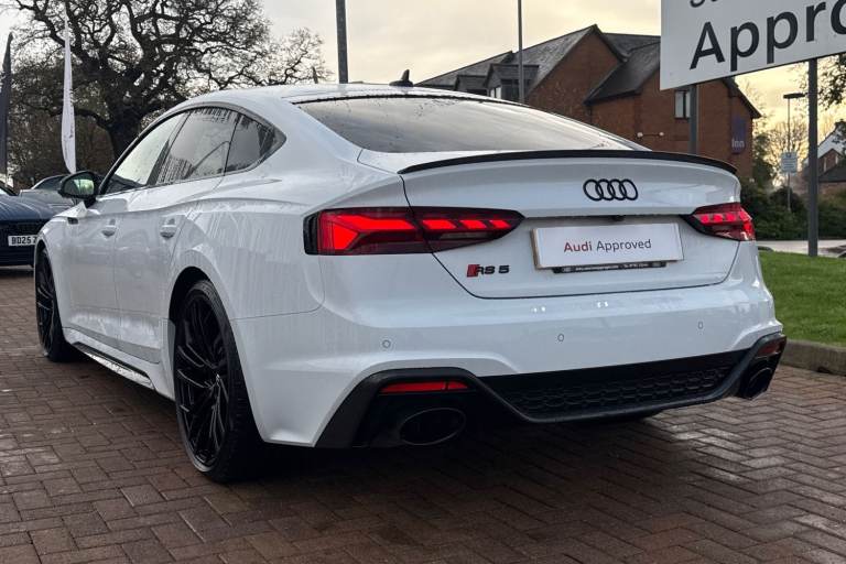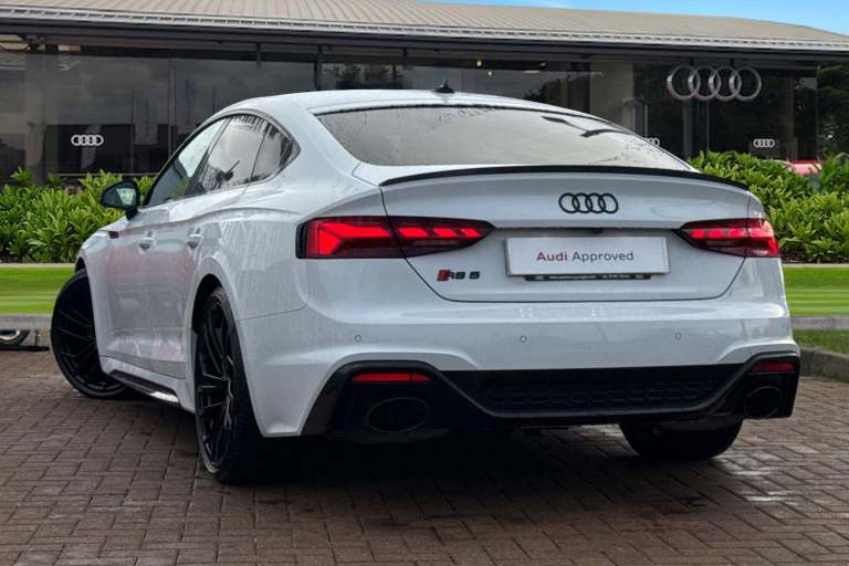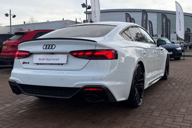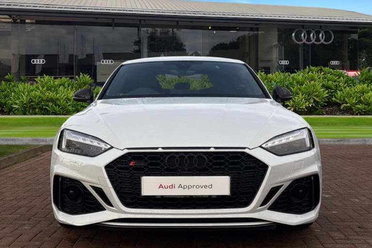 Experience the perfect fusion of high-performance engineering and everyday practicality with this striking Approved Used Audi RS 5 Sportback Carbon Black, finished in the ultra-clean and sophisticated Glacier White Metallic. This model combines Audi Sport power with an assertive, coupe-inspired design to deliver a truly exhilarating drive. Under the bonnet sits Audis renowned 2.9-litre twin-turbo V6, producing breathtaking performance with rapid throttle response and effortless acceleration. Paired with quattro all-wheel drive and an 8-speed Tiptronic gearbox, the RS 5 Sportback offers superb traction, precision, and confidence across all driving conditions. The Carbon Black specification enhances the RS 5s bold character with carbon-fibre exterior detailing, gloss-black styling elements, 19"" or 20"" Audi Sport alloy wheels (spec dependent), privacy glass, and Matrix LED headlights. The Glacier White Metallic paintwork provides a perfect contrast to the dark styling features, giving this car an unmistakable road presence. Inside, the cabin blends motorsport influence with premium comfort. Expect RS sport seats in fine Nappa leather, honeycomb stitching, flat-bottom RS steering wheel, carbon inlays, and Audis latest digital technology, including Virtual Cockpit Plus, MMI Navigation Plus, and Bang & Olufsen 3D sound on selected models. The spacious Sportback body style ensures usability without compromising on performance. Advanced assistance systems such as parking senso...