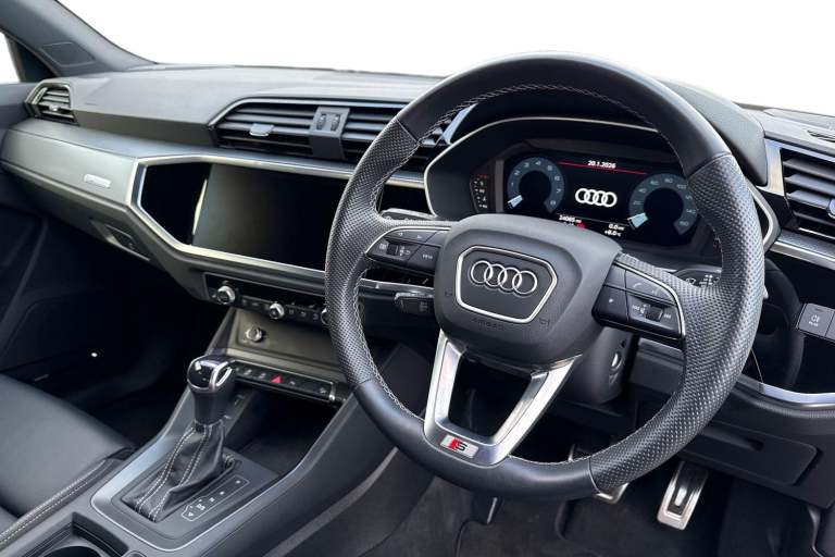 Check out this Audi Approved Q3 S Line 35 TFSI in Chronos Grey with its 19"" 5-twin-spoke dynamic design alloy wheels which look superb out on the roads. The LED headlights with LED rear lights create that strong visibility in all weather conditions. This Q3 has some fantastic optional extras, such as the Comfort and Sound pack which does include the Sonos 3D premium sound system, for that excellent sound experience. It also includes the rear-view camera which creates that additional vision and assists greatly whilst maneuvering those tighter spaces. The heated front seats are perfect for those cooler mornings. Some other brilliant features include the dual-zone electronic climate control which can be adjusted to your prefered climate on any journey. Connectivity is made seamless on all journeys, thanks to the Bluetooth Interface. ISOFIX child seat mounts are fitted to the front passenger and outer rear seats of this Q3, making it the perfect family vehicle. The hill-hold assist feature makes all hill starts even smoother. DAB/FM radio is fitted to this vehicle which gives a larger variety of stations for all passengers and driver to listen to and enjoy on any journey in this vehicle. The multimedia interface allows the driver and front passenger to access a range of different media, such as Apple Carplay and Android Auto, allowing you to use apps like Spotify, Google Maps, Apple Music and other apps also. The Audi drive select feature lets you choose your prefered dri...