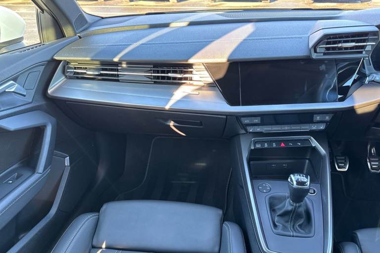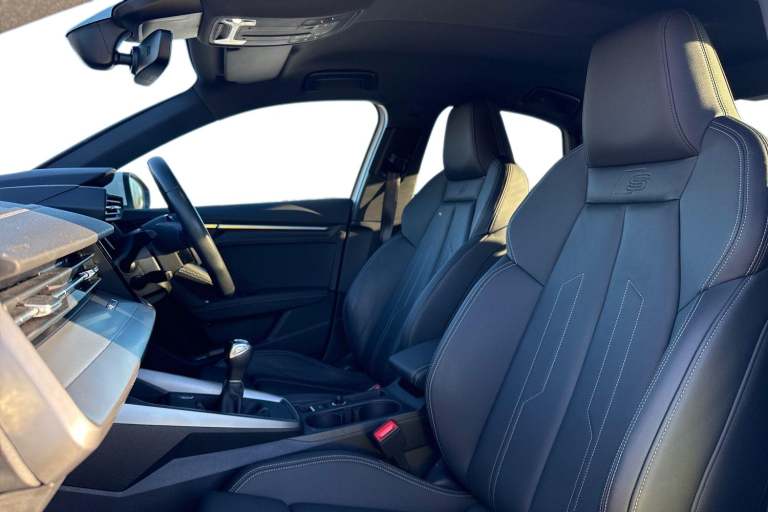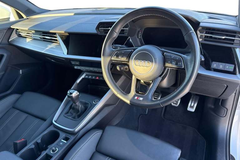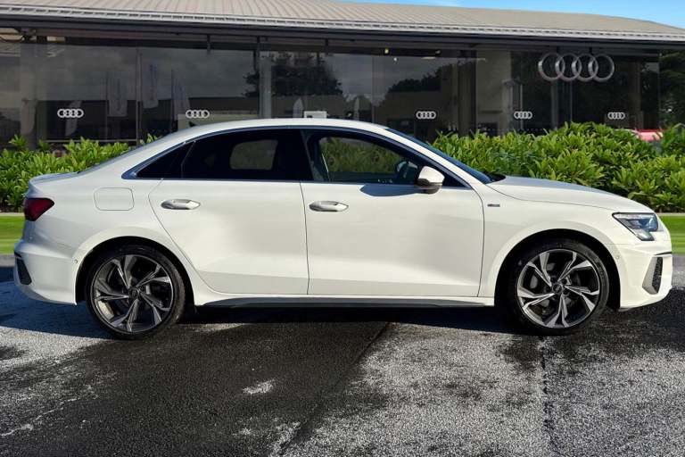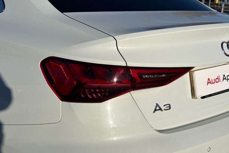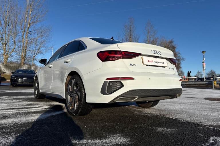 We are delighted to offer this Approved Used Audi A3 Saloon S line 30 TFSI 110 PS. Finished in the crisp Glacier White metallic paintwork, this A3 offers a refined combination of sporty styling, advanced technology, and everyday efficiency, making it an excellent choice within the premium compact saloon segment. The S line specification enhances the A3 Saloons sleek and dynamic appearance, with striking LED headlights providing excellent visibility and a modern light signature. The confident stance is further reinforced by large 18"" alloy wheels, which complement the cars sharp body lines and elegant saloon profile. Power is delivered by the efficient 30 TFSI petrol engine, producing 110 PS and paired with a smooth and engaging 6-speed manual transmission. This responsive powertrain delivers strong everyday performance with impressive fuel economy, ideal for both city driving and longer journeys. Inside, the cabin reflects Audis renowned build quality and driver-focused design. Deluxe dual-zone climate control allows both the driver and front passenger to set their preferred temperature, while heated front seats provide added comfort during colder weather. The premium Bang & Olufsen 3D Premium Sound System delivers an immersive audio experience, elevating every journey with exceptional sound clarity. Manoeuvring and parking are made easy thanks to the inclusion of a reversing camera, offering clear visibility and added confidence in tight spaces. A wide range of additi...