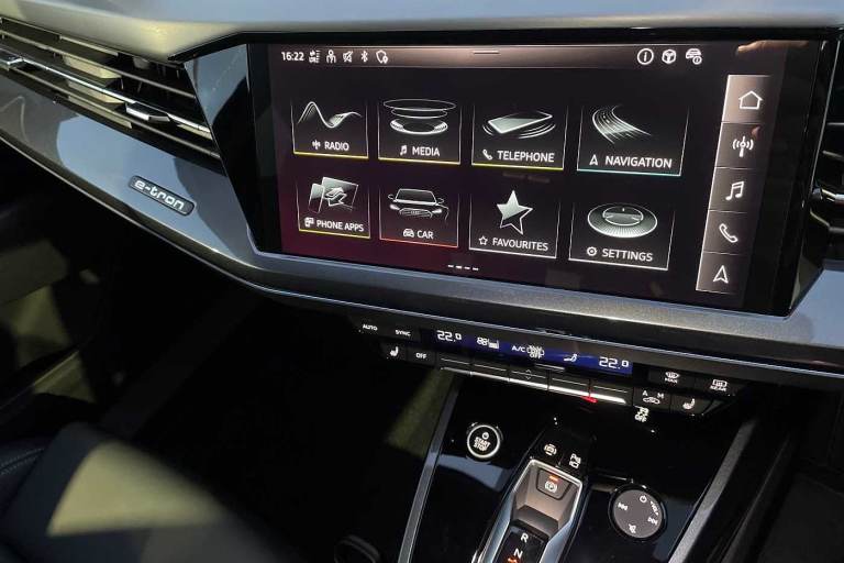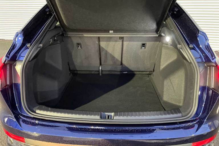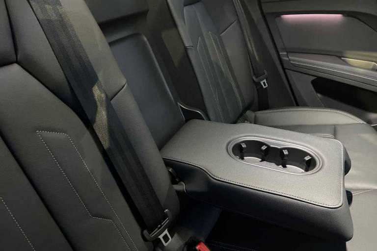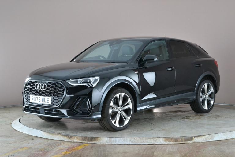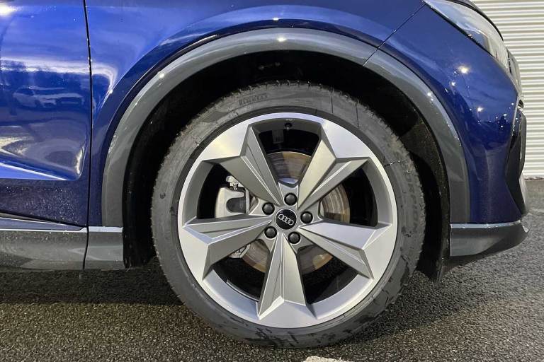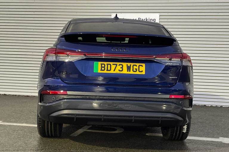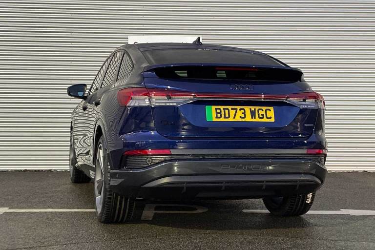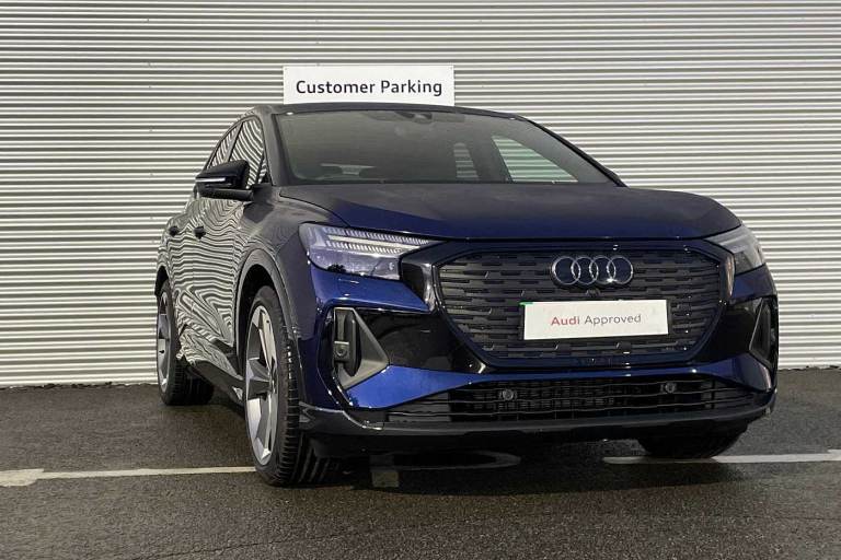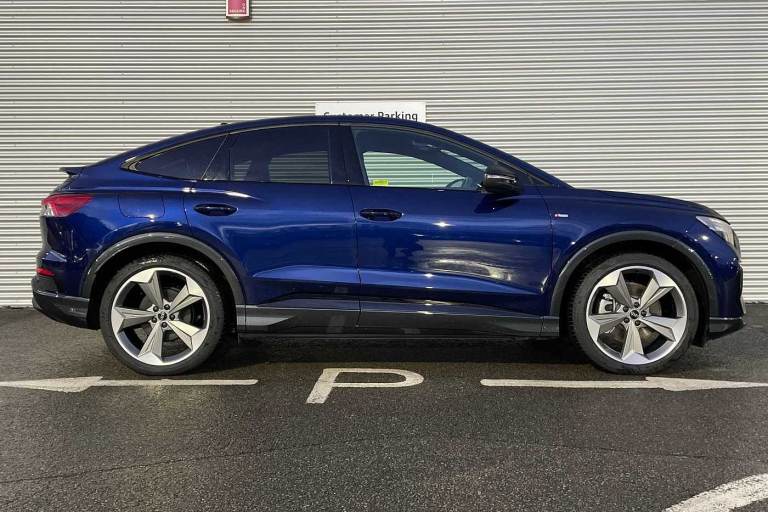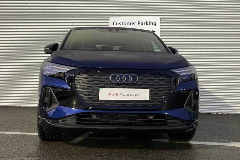 Available from 22/01/2025. Audi Q4 e-tron Sportback 220kW 50 Quattro 82kWh Black Edition 5dr Auto in Navarra blue, metallic. Specification Includes Operating permit, alteration,Contrast bumpers in Manhattan grey, paint finish,S line exterior styling,Accent surfaces in Gloss black,Reversing camera,Twin leather with S embossing,Interior package for Front Sport seats in Twin leather,Assistance pack plus,Exterior pack,Aluminium look interior elements,Privacy glass,Ambient Lighting Pack Plus,Front sport seats with integrated head restraints,Stainless steel pedals and footrest,Front door sill trims with aluminium inlay, illuminated with 'S' logo,Technology Pack,Equipment package for Great Britain,Sport Suspension,Tool kit,Flat top and bottomed twin-spoke leather multifunction Sport steering wheel with shift paddles for recuperation,S line bumpers,Deletion of power/technology character,Split-folding rear seat bench - can be split 40:20:40 or fully, with centre armrest and cup holders,Electric luggage compartment lid,Advanced key,Black appearance package plus,Inlay in Dark matt brushed aluminium,21in x 8.5J (front) 9.0J (rear) 5-arm rotor 'evo' Audi Sport alloy wheels, matt grey, gloss turned, with 235/45 (front) 255/40 (rear) R21 tyres,Black door mirrors,Steering wheel with elements in chrome,Lane departure warning,Black cloth headlining,Rear 12V socket and 2 x USB-C connections for charging devices,Door armrests in leatherette,Audi Parking System Plus,Matrix LED headlights with digital light signatures, dynamic light sequencing and dynamic indicator,Matrix LED headlamps,Adaptive cruise control with speed limiter,LED rear lights with illuminated light strip, dynamic indicator and dynamic light sequencing,Headlight washer system,SONOS Premium Sound System,9ZV,Assistance pack plus,S line Twin leather pack,Equipment options subset for Great Britain.