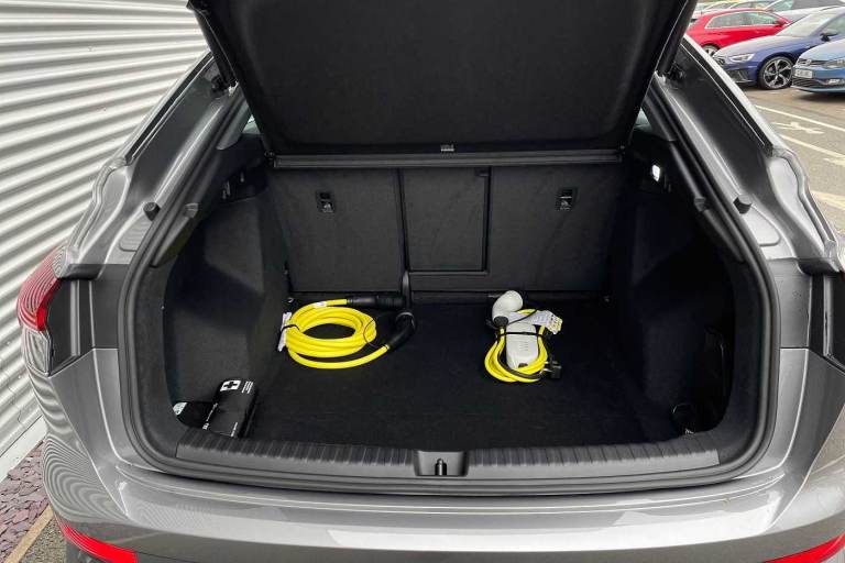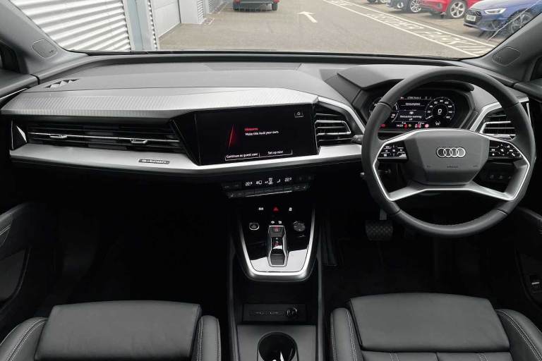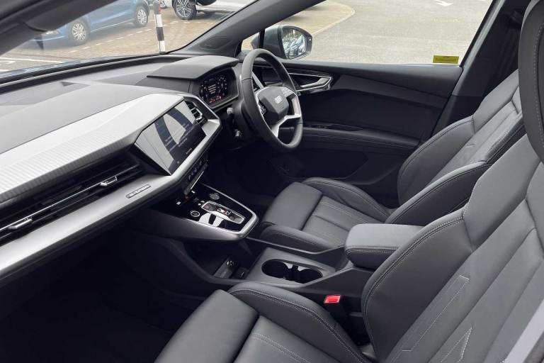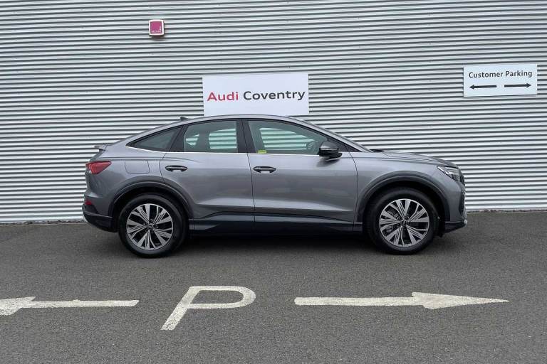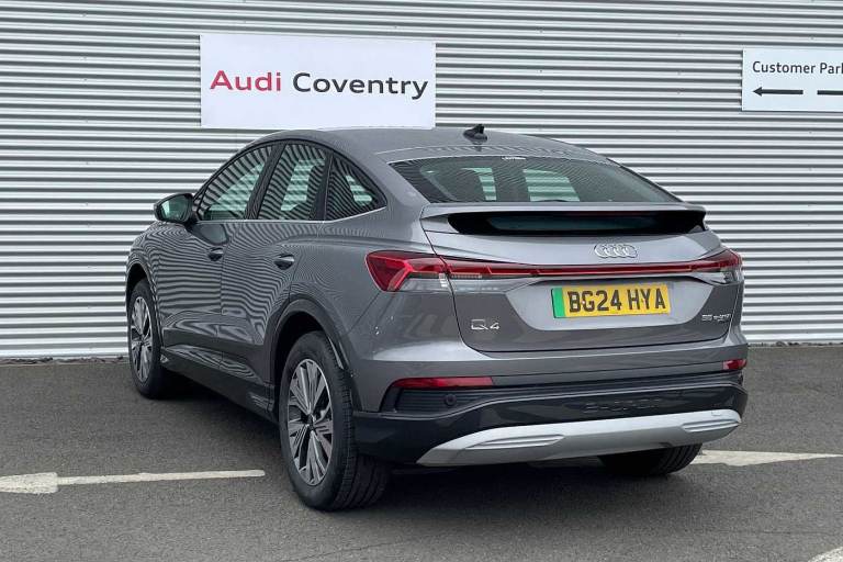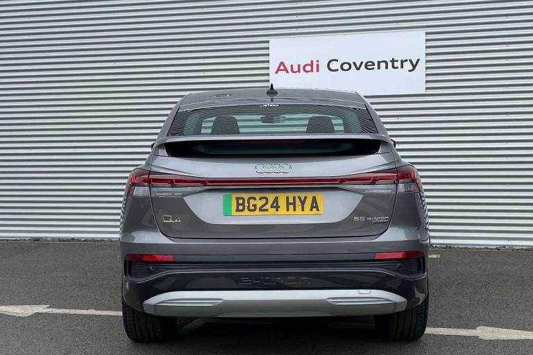 Available from 11/06/2025. Audi Q4 e-tron Sportback 250kW 55 Quattro 82kWh Sport 5dr Auto (Leather) in Typhoon grey, metallic. Specification Includes Operating permit, alteration,Accent surfaces in Gloss black,Reversing camera,Twin leather,Interior package for front Sport seats in twin leather with integrated head restraints,Assistance pack plus,Aluminium look interior elements,Ambient Lighting Pack,Front sport seats with integrated head restraints,SWIN management,Special control,Standard pedal cluster and foot rest,Technology Pack,Equipment package for Great Britain,Split-folding rear seat bench - can be split 40:20:40 or fully, with centre armrest and cup holders,Electric luggage compartment lid,Advanced key,Inlay in aluminium convergence,Steering Wheel with elements in chrome,Headlining in Steel grey cloth,Rear 12V socket and 2 x USB-C connections for charging devices,Door armrests in leatherette,Front door sill trims with aluminium inlay,Audi Parking System Plus,Matrix LED headlights with digital light signatures, dynamic light sequencing and dynamic indicator,Matrix LED headlamps,Adaptive cruise control without speed limiter,LED rear lights with illuminated light strip, dynamic indicator and dynamic light sequencing,Headlight washer system,SONOS Premium Sound System,9ZV,Assistance pack plus,Twin leather pack,Equipment options subset for Great Britain.