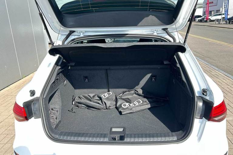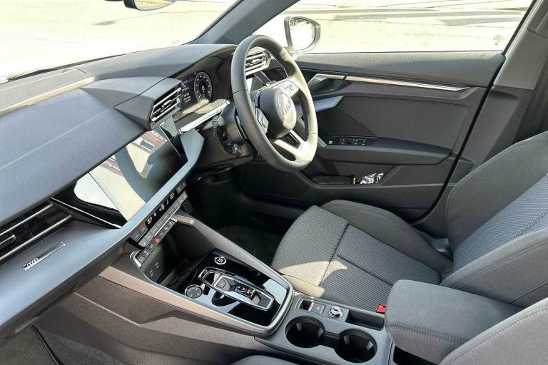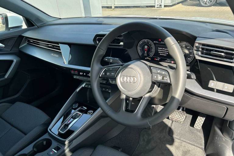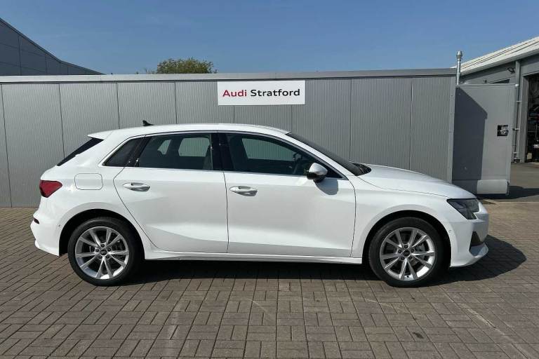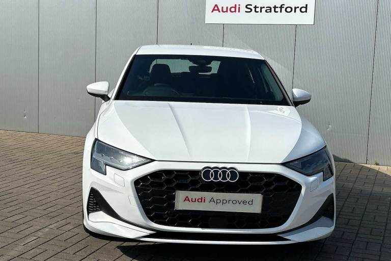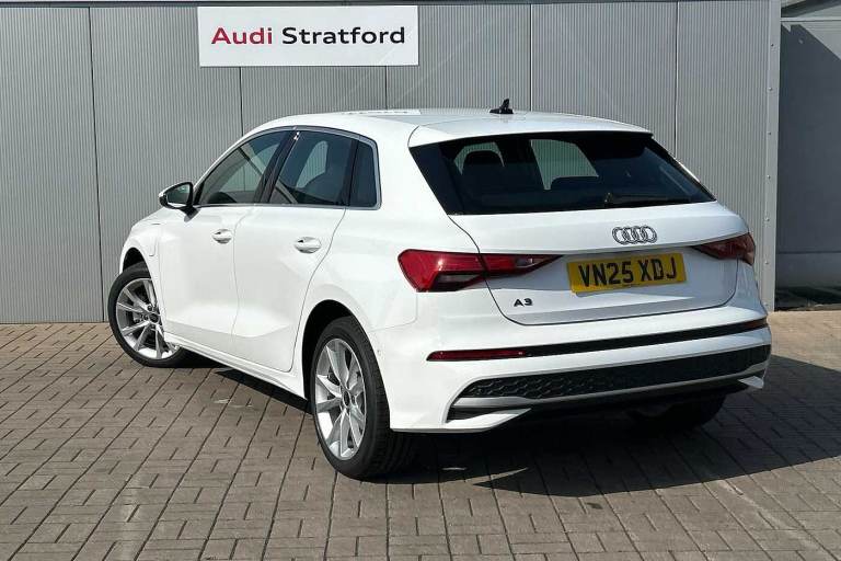 Available from 28/10/2025. Audi A3 Sportback 40 TFSI e Sport 5dr S Tronic in Arkona white, solid. Specification Includes Equipment options subset for Great Britain,17in x 8.0J '5-V-spoke' style alloy wheels with 225/45 R17 tyres,LED Interior Lighting Pack,DAB digital radio,Sports seats in front,3-spoke leather multi-function steering wheel with gear-shift paddles for S tronic transmissions,Audi Drive Select,Heated front seats,Auto-dimming rear-view mirror,Front centre armrest,Exterior mirrors, electrically adjustable, heated, folding and auto dimming on both sides,Tyre-pressure loss indicator,MMI Navigation Plus with high-resolution 10.1in touch screen, colour display,Park assist with parking aid Plus,LED headlights with LED daytime-running light. Halogen lights in the rear,Separate daytime running light,Light and rain sensors,Audi virtual cockpit plus,Audi sound system,Audi phone box light with wireless charging,MMI experience plus.