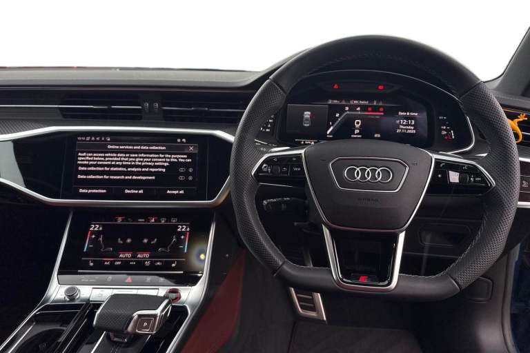 This outstanding Approved Used Audi S7 Sportback Black Edition, finished in the breathtaking Ascari Blue Metallic, offers an irresistible blend of style, performance, and luxury. Its eye-catching exterior is paired perfectly with the rare and dramatic Arras Red leather interior, creating a specification that stands out from every angle. Powered by the impressive TDI engine, the S7 delivers muscular performance with exceptional refinement and efficiency, making it ideal for both spirited driving and long-distance comfort. The Black Edition styling package enhances its road presence with gloss black exterior accents, privacy glass, large alloy wheels, and striking HD Matrix LED headlights. Inside, the cabin radiates quality and craftsmanship. The Arras Red Valcona leather seats, with heating for added comfort, create a bold and luxurious atmosphere. Technology is abundant throughout, including the impressive 360° camera system, which provides complete visibility when manoeuvring, and the Bang & Olufsen 3D Premium Sound System, delivering a rich, immersive audio experience. Audis dual touchscreen MMI Navigation Plus system and Virtual Cockpit Plus offer seamless control of navigation, media, and vehicle settings, while Audi Drive Select allows the driver to tailor the cars dynamics to suit every journey. The S7s sleek Sportback design ensures excellent practicality with a spacious interior, generous boot capacity, and superb ride comfort, making it as easy to live with as...