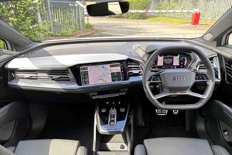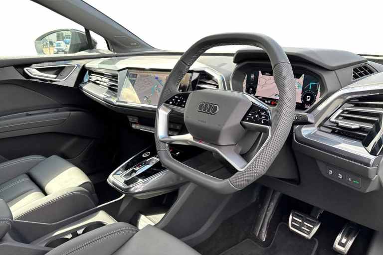 11 kW Onboard Charger, 175kW DC Charging Capability, 2 USB-C Ports with Charge and Data Functions, 3-Zone Automatic Air Conditioning, 21in Alloy Wheels - 8.5J Front - 9.0J Rear - 5-Arm Rotor Evo - Matt Grey - Gloss Turned Finish - Audi Sport, 4-Way Electric Lumbar Support for Front Seats, AC and DC Charging access Point on Driver Side Rear, Acoustic Vehicle Alerting System - AVAS, Adaptive Cruise Control with Speed Limiter, Advanced Driver Attention and Drowsiness Monitor, Anti-Theft Alarm, Anti Theft Locking Wheel Bolts, Audi Application Store and Smartphone Interface, Audi drive select, Audi Sound System, Bluetooth Interface, Comfort Key and Safelock, Comfort Auxiliary Air Conditioning, Comfort Package, DAB Digital Radio, Door Mirror Housing - Body Coloured, Electronically Operated Child Locks, Front Centre Armrest, Front and Rear Floor Mats, Heated Front Seats, I-Size Child Seat Mounting on the Front Passenger Side and I-Size and Top Tether on the Outer Rear Seat, Keyless Go, Rear-View Camera, Seat Belt Monitoring, Tyre Pressure Loss Indicator, Mythos Black, Twin Leather - Front Sport Seats with S Embossed Logo - Black with Rock Grey Stitching