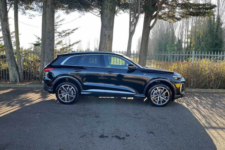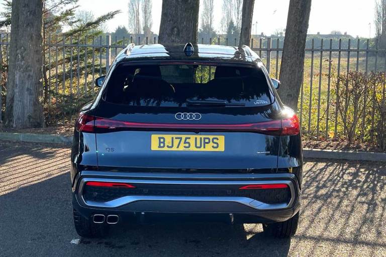 Available from 29/01/2026. Audi Q5 Diesel Estate 2.0 TDI Quattro S Line 5dr S Tronic in Mythos black, metallic. Specification Includes 20in x 8.0J 5-twin-spoke black metallic, gloss turned finish Audi Sport alloy wheels with 255/45 R20 tyres,Operating permit, alteration,S line exterior styling,Accent surfaces and control buttons, Gloss Black,Head-up display,Twin leather - leather / artificial leather combination with embossed 'S',Storage & luggage compartment pack,Interior S with sport seats in leather/artificial leather combination, Black,Storage and luggage compartment package,Sun protection glass, tinted,Ambient lighting package pro with dynamic interaction light,Sport seats, front,Upper and lower interior elements in artificial leather,Increased charging capacity for USB ports,Stainless steel pedals and footrest,Door sill trims with aluminum inlays, front, illuminated, S logo,Equipment package for Great Britain,Sound and Vision Pack,Internal control code,S sport suspension,Sport leather steering wheel, 3-spoke, flat top and bottom with multifunction and shift paddles,Bumpers, S line,Panoramic glass sunroof,Rear seat bench plus,Anthracite matt brushed aluminium inlays with linear embossing,Front head restraints,Comfort center armrest, front,Steering wheel trim in chrome look, S emblem, st. wheel grips in perforated leather and contrasting stitching,Headlining in cloth, Black,Upper part of instrument panel, Black with contrasting stitching,4-way lumbar support for the front seats,Bang & Olufsen 3D Premium Sound System,Feature package 2 (for Audi only),MMI experience pro,Interior package with front Sport seats with integrated headrest and 'S' embossed logo in Twin leather*,Equipment options subset for Great Britain.
