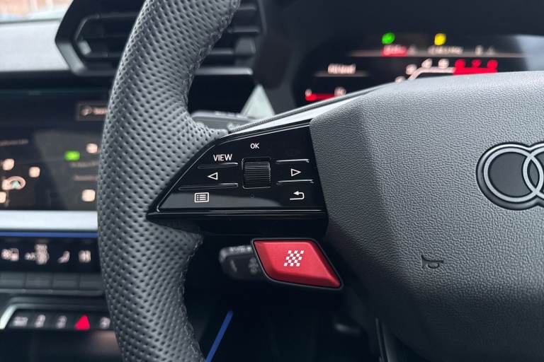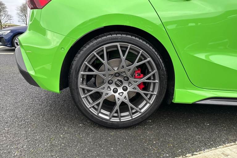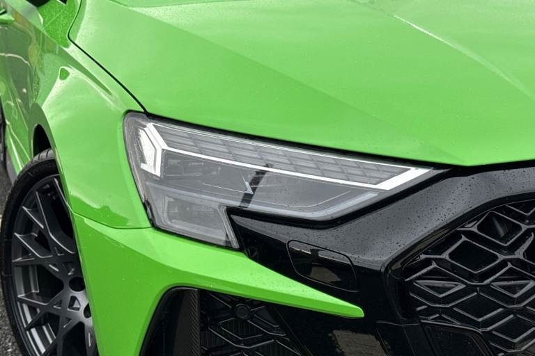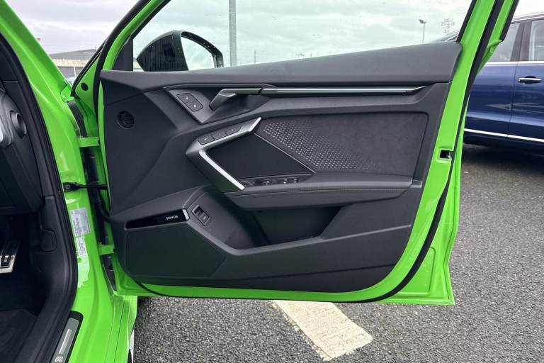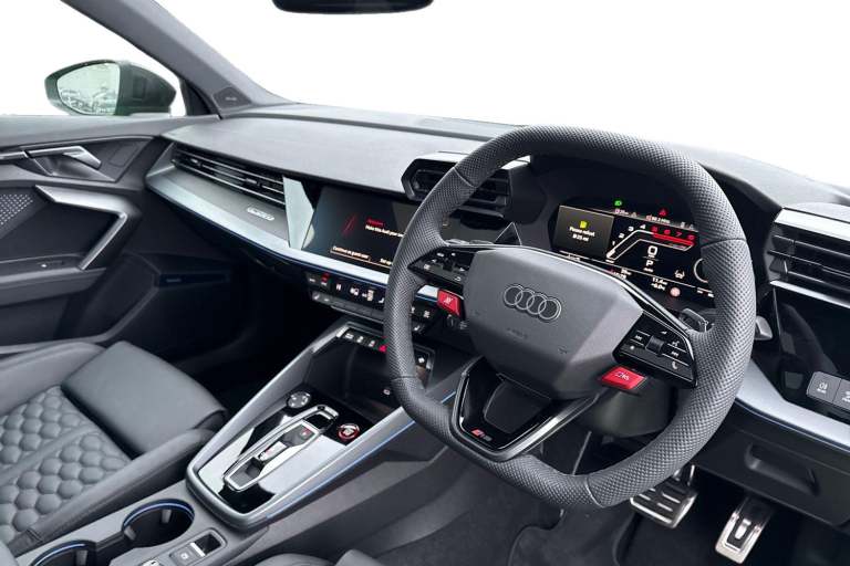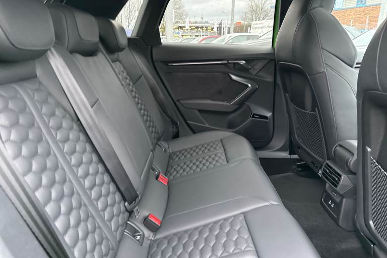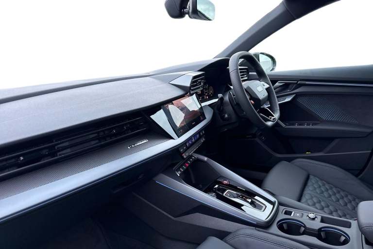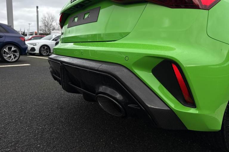 The Audi RS 3 Sportback is the perfect vehicle for thrill seekers, and this Carbon Black is no exception. Finished in Mythos Black, this Audi RS3 is built with the 2.5 litre TFSI petrol engine and S Tronic automatic gearbox that provides 400PS. Able to go from 0-62 in just 3.8 seconds this vehicle is built for performance, with a lap around the Nurburgring ring taking a mere 7:33.123 minutes. Vehicle price shown includes a deposit contribution of £4000 when purchased on finance by 31/03/2026. Solutions Personal Contract Plan. 7.9% APR Representative. Audi Financial Services. Terms and Conditions apply. This RS3 sits on a set of 19"" alloy wheels, with upgraded red brake calipers, designed to stand out from the crowd no matter the driving conditions. The exterior comes with carbon features, including wingmirrors, details and a carbon roof spoiler. To the front of the vehicle is a set of Darkened Matrix LED headlights that add to the aggressive look of the exterior, perfectly illuminating the road as you drive. The RS sports exhaust is fitted to the rear, allowing you to look and sound good. Inside, youll find a sporty flat top and bottom steering wheel that allows you to easily control your music, cruise control and Audi Virtual Cockpit. This steering wheel also comes with the RS and Checkered Flag buttons that allow you to easily control performance and exhaust settings. The dash is equipped with an MMI Touchscreen where you can easily adjust settings and connect your p...