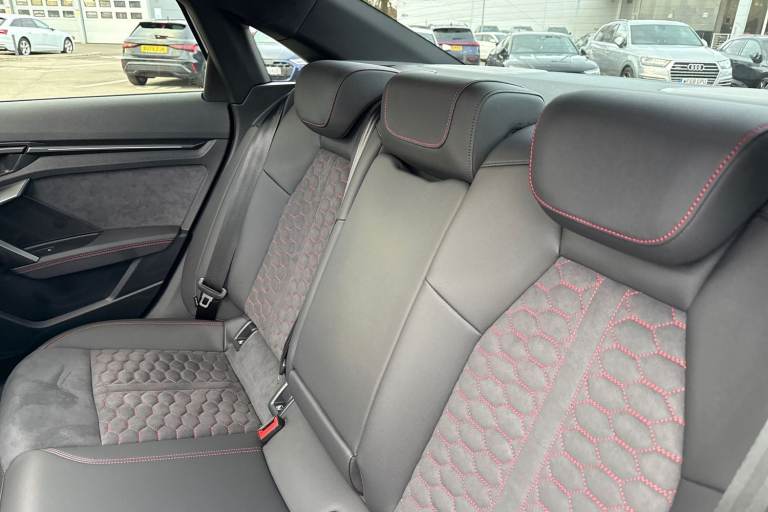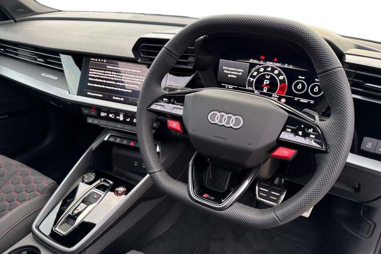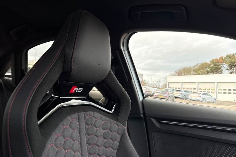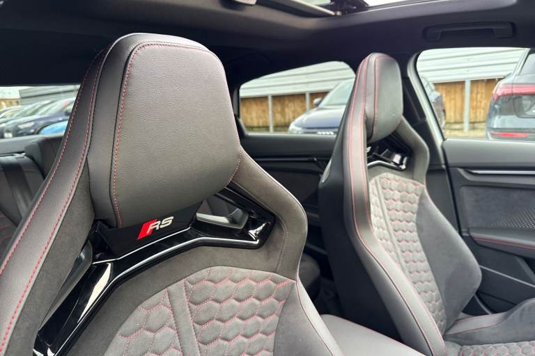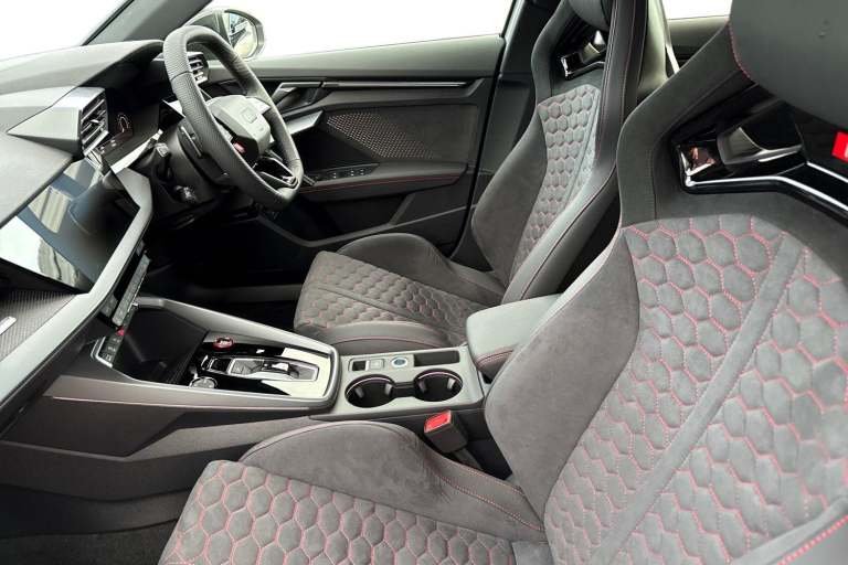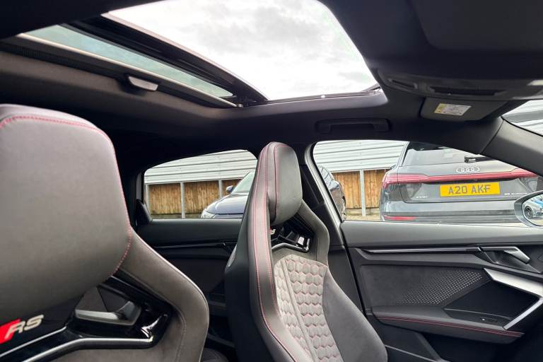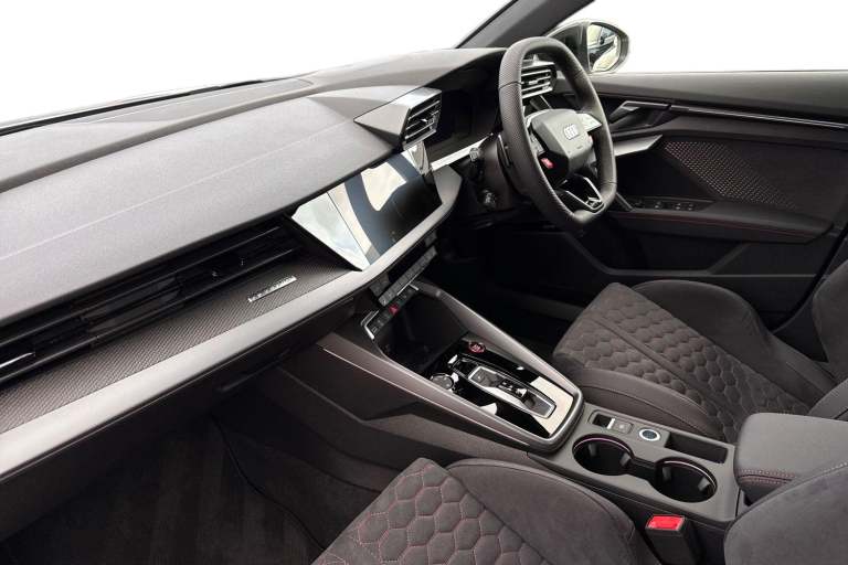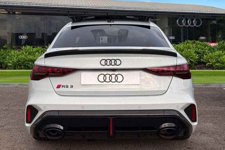This car has Audi Exclusive Paint in Suzuka Grey. Immediate delivery. Have a look at this Brand-New Audi RS3 Saloon Carbon Vorsprung in the stunning Audi exclusive paint finish in Suzuka Grey, with its 19"" 10-cross spoke alloy wheels which look superb out on the roads. The Matrix LED headlights with LED rear combination lights create that strong visibility in all weather conditions. This RS3 comes equipped with some fantastic optional extras, such as the red brake calipers, to really stand out on the roads. Other brilliant features include the Technology pack pro, which does include the panoramic glass sunroof, which floods the cabin with light and is perfect for those sunny days. The heated front seats are perfect for those cooler mornings. The Sonos premium sound system creates that excellent sound experience for everyone to enjoy. Another brilliant feature, is the 360 degree camera which maximises vision and assists greatly in all maneuvering situations. The Audi phone box with wireless charging, makes fully charging or just topping up your phones battery on any journey, a breeze. The multimedia interface allows the driver and front passenger to access a range of different media, such as Apple Carplay and Android Auto, allowing you to use apps like Spotify, Google Maps, Apple Music and other apps also. The Audi drive select feature lets you choose your prefered drive mode on any journey, for a ore personalised driv...