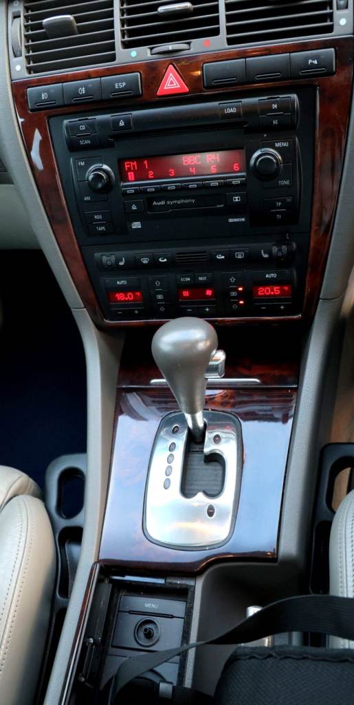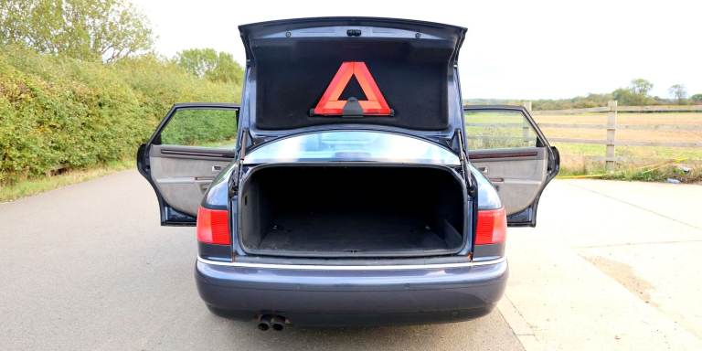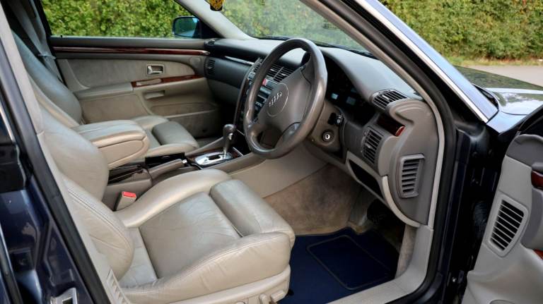 It has a tilt and slide sunroof, 4 x electric windows, extended leather interior, Recaro all electric leather seats, front and rear heated seats (very rare), memory seats with 4 position memory settings, Xenon lights, dual climate control, cruise control, electric mirrors, electrically adjustable steering column, tiptronic gears (you can change gears from the steering wheel as well as with the gear stick), dark wood walnut trim, Audi Symphony sound system with CD multichanger and bluetooth connectivity so you can take calls handsfree, ice cold air con, parking sensors all round, 2 keys, arm rests, twin exhausts and an Audi 20" spare alloy wheel in the massive boot, which is easily big enough for 2 sets of golf clubs. The engine bay is beautifully clean and this is the only D2 I have seen in this shade of blue, making it rarer still.