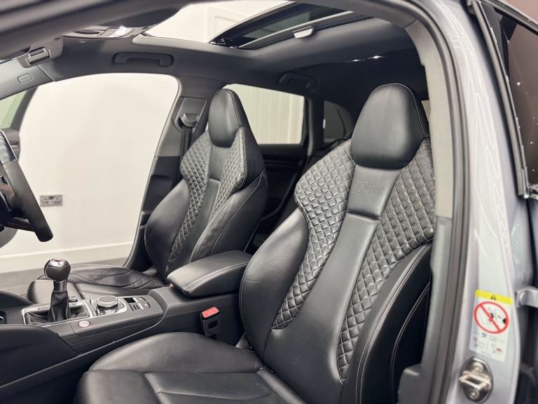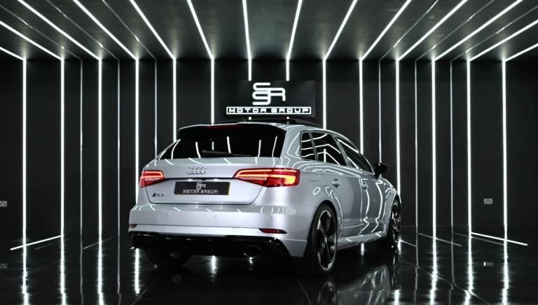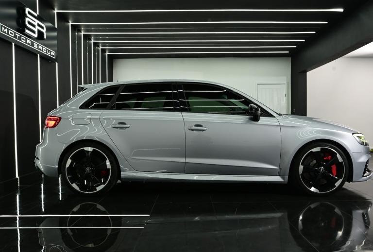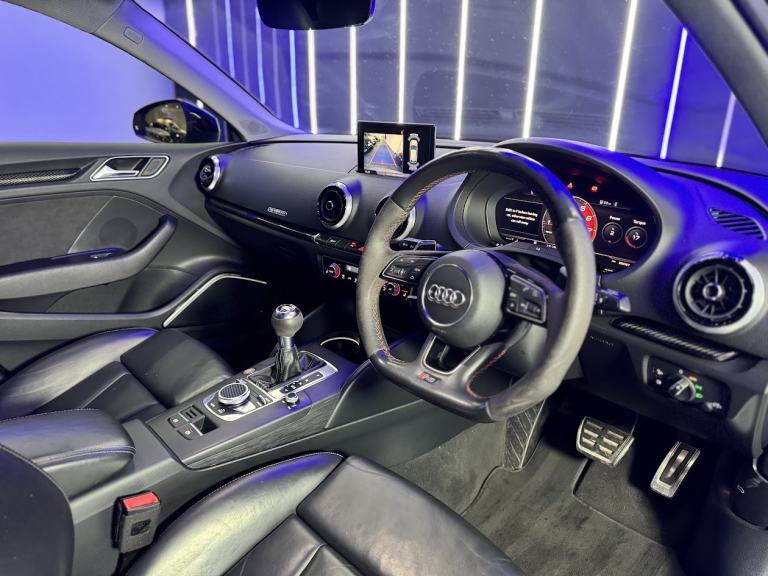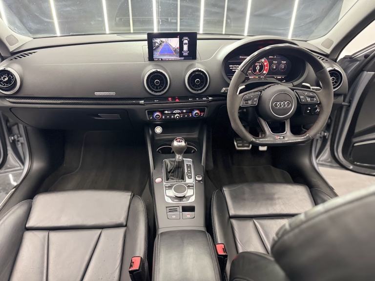 Audi RS3 Sportback finished in striking silver paint. A superbly specified example featuring the Super Sport leather interior, Bang & Olufsen sound system, Comfort & Sound Pack, carbon interior inlays, and a panoramic glass sunroof. Completing the exterior are 19-inch Audi Rotor alloy wheels, while a reverse camera enhances everyday usability. Backed by a full Audi service history and 2 keys, this RS3 delivers exceptional performance alongside refinement, comfort and practicality in a true performance hatch.