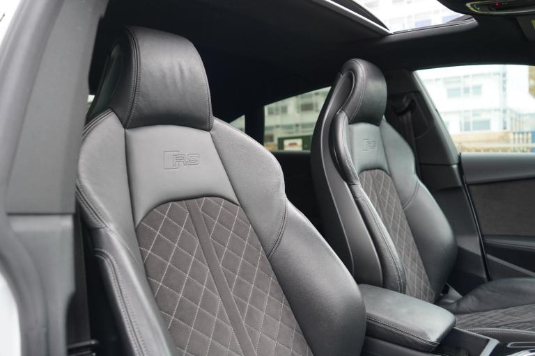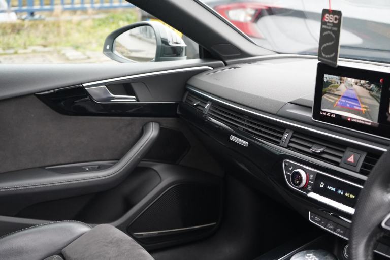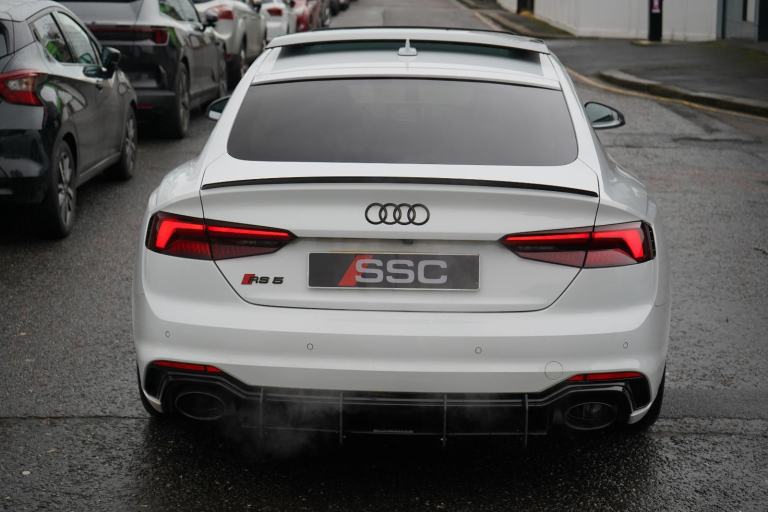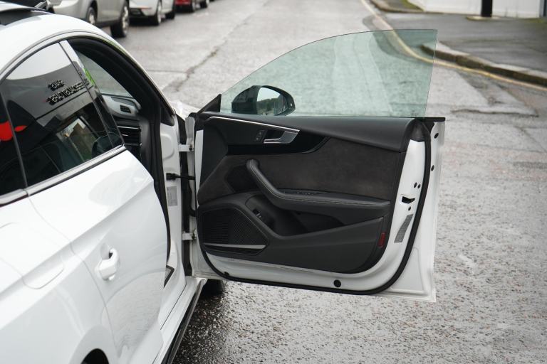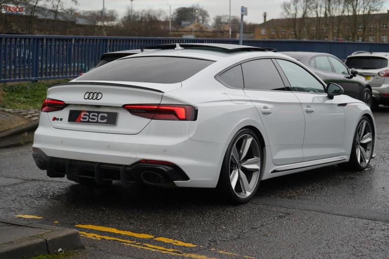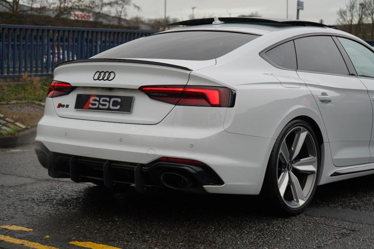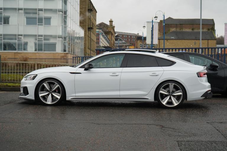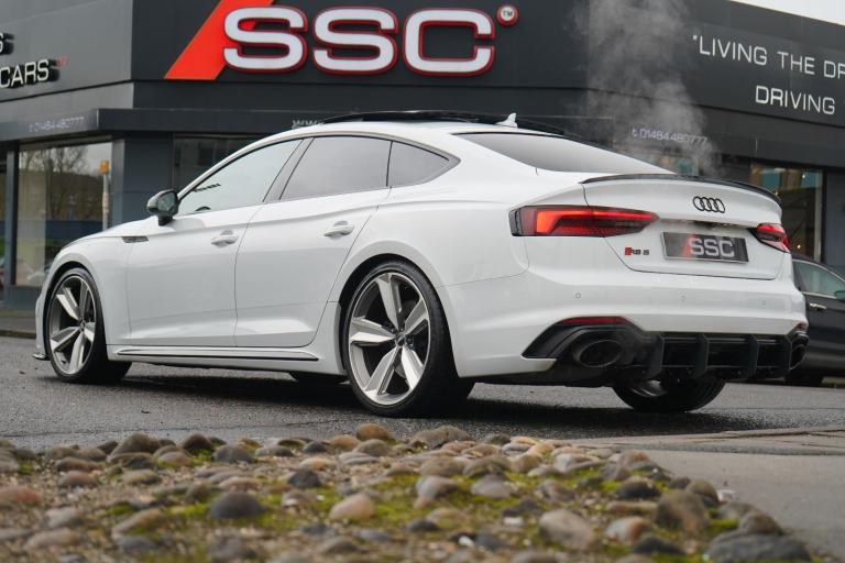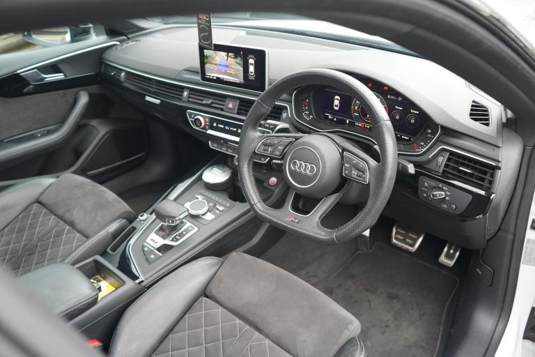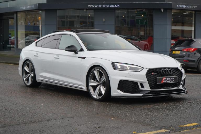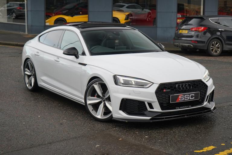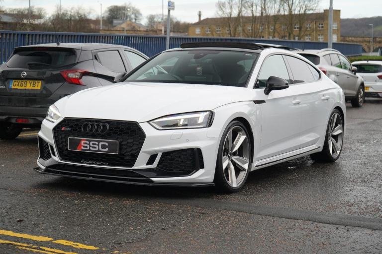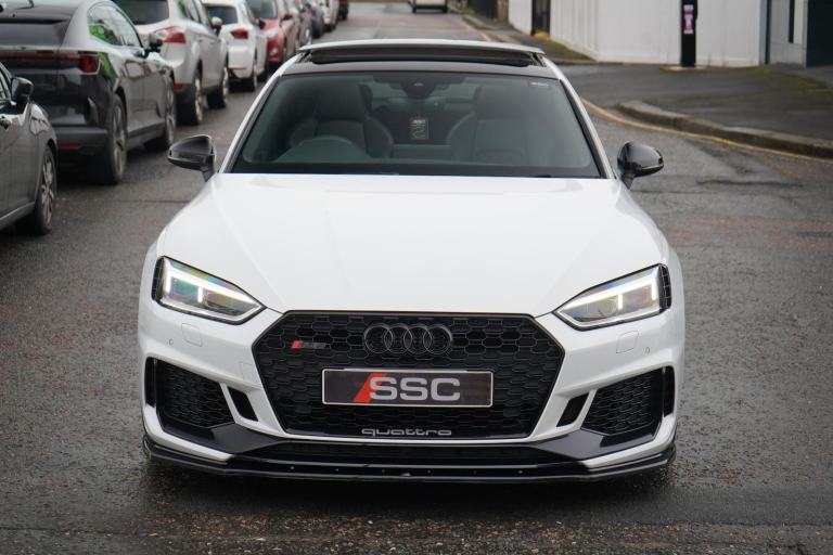 Stunning RS5 Sport Edition Sportback Finished In White With Black Alcantara and Leather Quilted Interior. Fantastic Spec Inc: Comfort and Sound Pack, Bang & Olufsen Surround Sound, Panoramic Glass Sunroof, RS Sports Exhaust System, 20" 5 Arm Audi Sport Alloys, Black Styling Pack, Electric and Heated Super Sports Seats With Massage Function, Piano Black Inlays, Power Tailgate, Virtual Cockpit, MMI Navigation Plus, Drive Select, LED Headlights, High Beam Assist, Privacy Glass, Wireless Charging, Smartphone Interface, Flat Bottom RS Steering Wheel, Hill Hold Assist, Pre Sense City, Blind Spot Assist. This RS5 Comes With Full Service History.