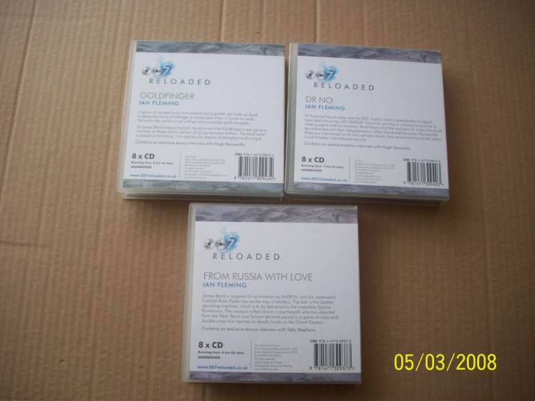 all from my own collection, 3 james bond cd audiobooks complete and unabridged on cd, all discs in excellent condition, very good boxs and artwork, collect paulsgrove po6 or i can post for an extra £4.50 tracked royal mail, any questions please ask payment by bankers draft or p-pal only