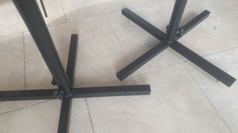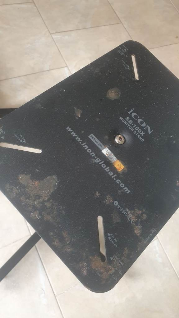 Icon speaker stands, adjustable height - anti vibration pin shaped feet on the bottom, forgot to take a photo of those - a little rust on the top plate on one of them and the height adjusting pin could also do with a little rust removal - but they are super sturdy and have been in storage for many years now as I no longer need stands for my studio speakers.