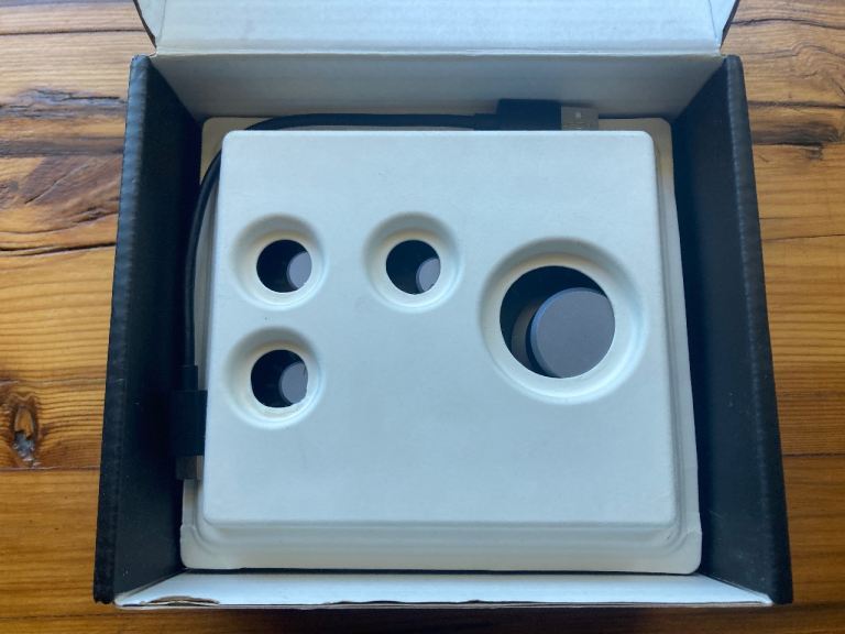 Boxed in original box and includes own short usb c cable for immediate plug and play
