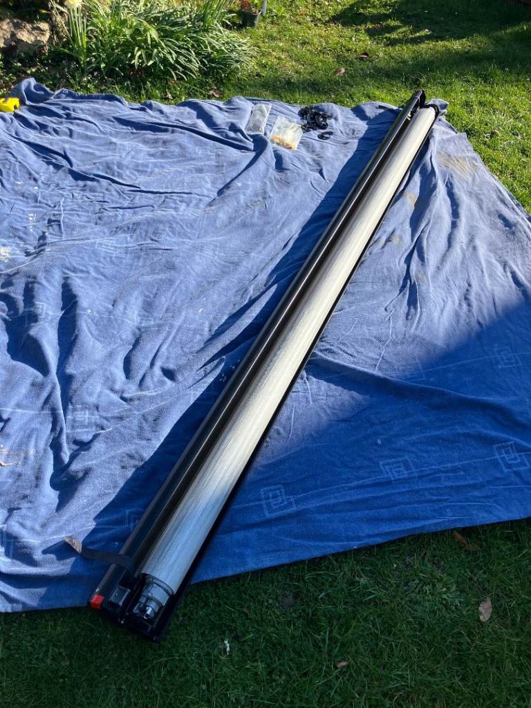 A manual roll-out canopy awning which packs in to a compact and sturdy lightweight aluminium case.