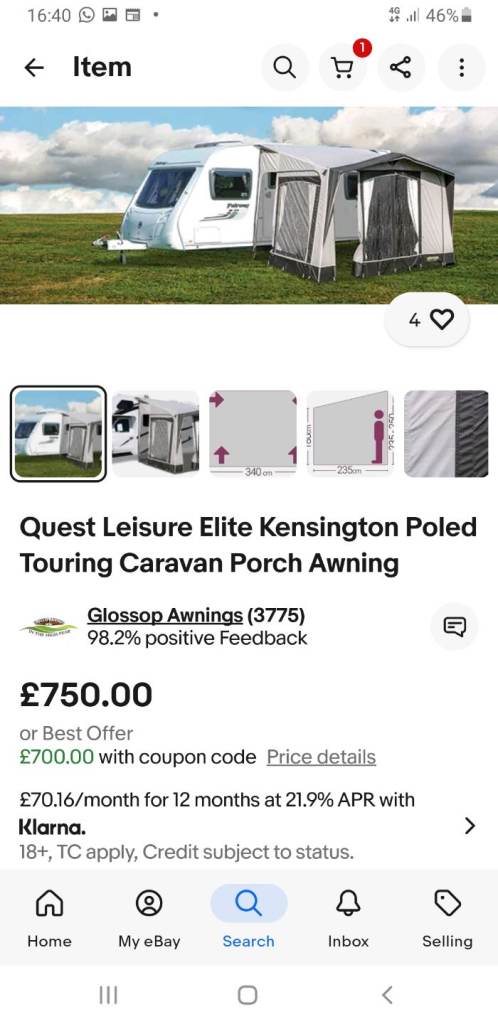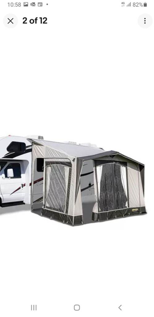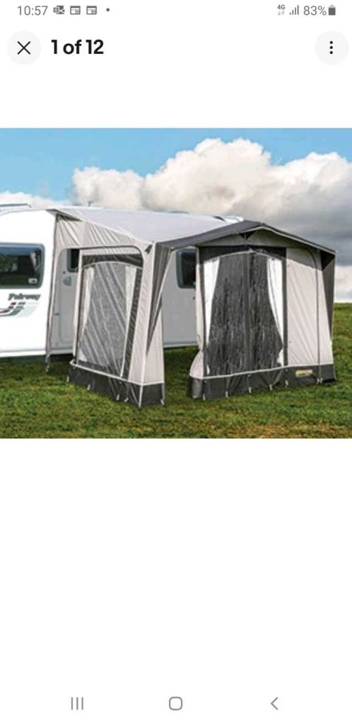 Quest elite Kensington awning, charcole colour, put up once to test it, in new condition, 3.4m wide x 2.35m deep , complete with poles, curtains, pegs and skirt, collection from MSG