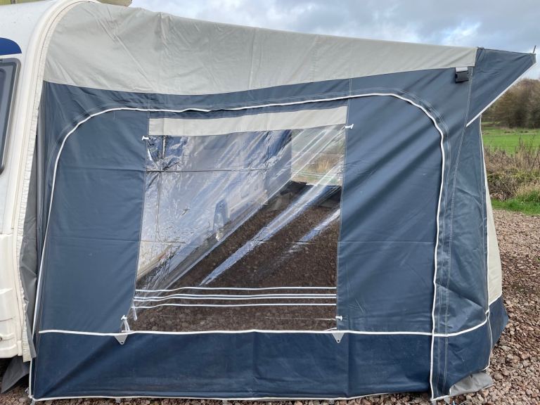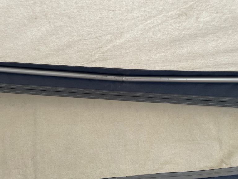 Dorema Daytona full awning, size 16. Comes with pegs, skirt, breathable ground sheet, carpet, original curtains and 2 annexes. It’s poles are made from aluminium. I’ts in good condition, except the front two horizontal poles are damaged, as shown in the images. One is slightly bent and the other is broken. I’ve inserted a smaller tube inside the broken pole, and this works fine for support. There are also intermediate poles not shown in the images. I erected the awning just to get images to sell it, because I haven’t got any pictures of the awning from holidays where it was fully set up.