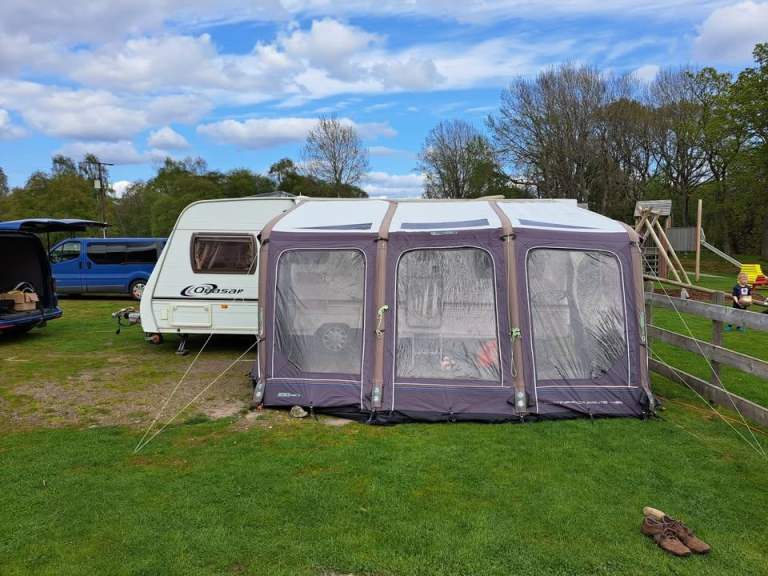Fantastic Awning which we have sadly not really used. It is approximately 4m long and includes a manual (hand) pump to inflate the structure. Please note, there is no ground sheet. No offers please, I paid £350 (second hand) and have used it twice.
