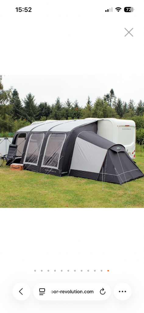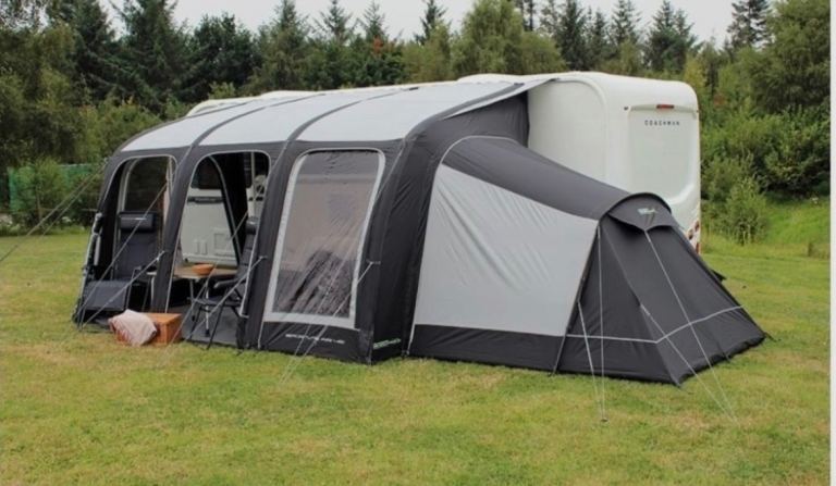 Outdoor Revolutions Sportlite 400 air caravan awning complete with 2 side extension comes with carpets for all three parts. Good condition however has a slight whole(approximately 2-3mm) in the side door panel of the main awning( this has been caused by the awning door panel being folded and not used, if attaching both extensions then this door is not required). Complete with air hand pump and external bags. Please note photos only show one side extension.