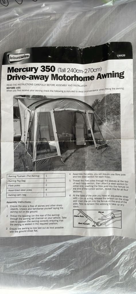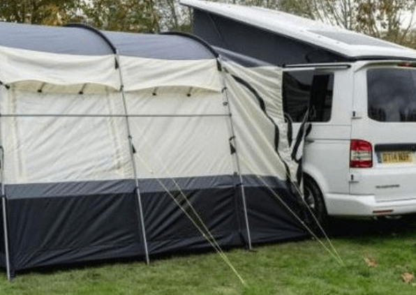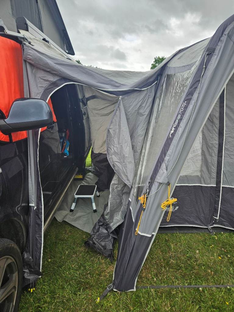 Enough room to sit inside with a table and chairs. It also has nice ‘porch’ area with overhead cover so you can sit outside with shade/shelter from the elements. It points forward next to your van whereas some have you sitting at 90 degrees, effectively looking at your neighbour.