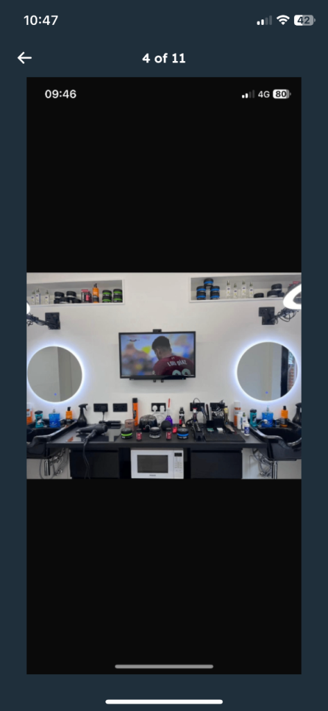 The shop has X2 Barber Chairs, X2 HairWash Sinks, X2 LED Mirrors, X1 Leather seating area, 3 TVs for sports and playstation entertainment for cusotmers while they wait in comfort and style!