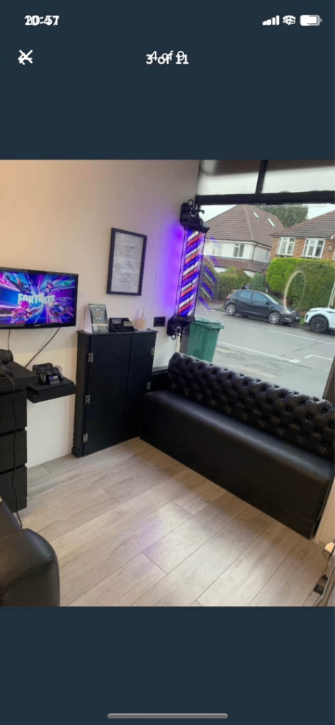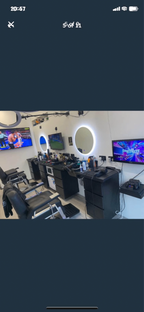 The shop has X2 Barber Chairs, X2 HairWash Sinks, X2 LED Mirrors, X1 Leather seating area, 3 TVs for sports and playstation entertainment for cusotmers while they wait in comfort and style!