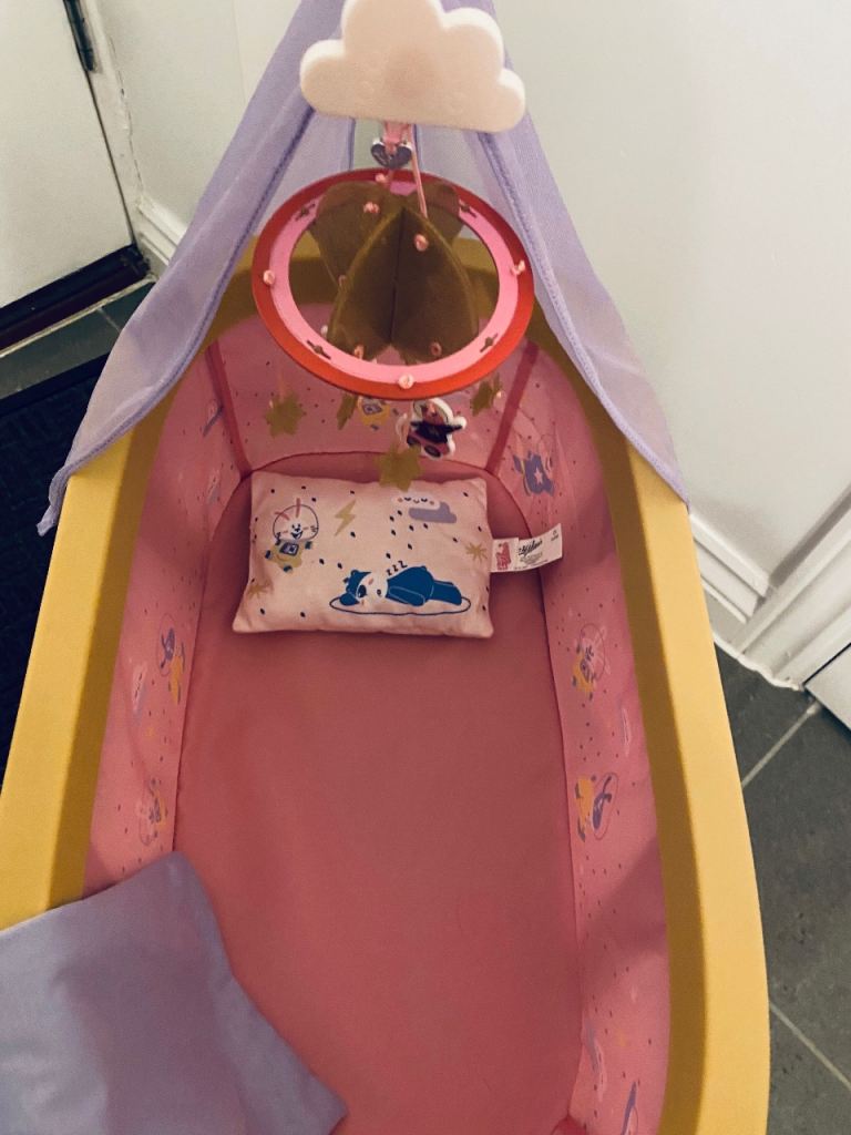 Baby born bassinet comes with soft blanket and pillow also has a mobile