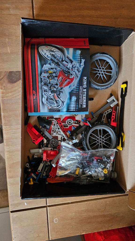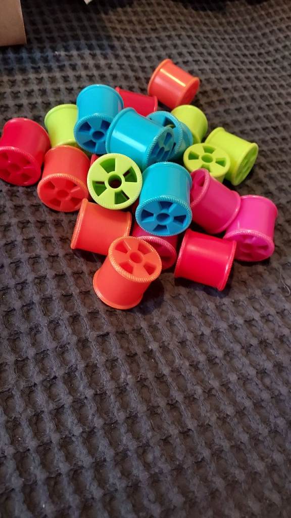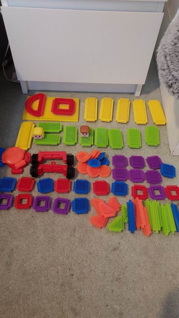 Includes various interlocking blocks, plastic balls, and spinning bobbin-style pieces.