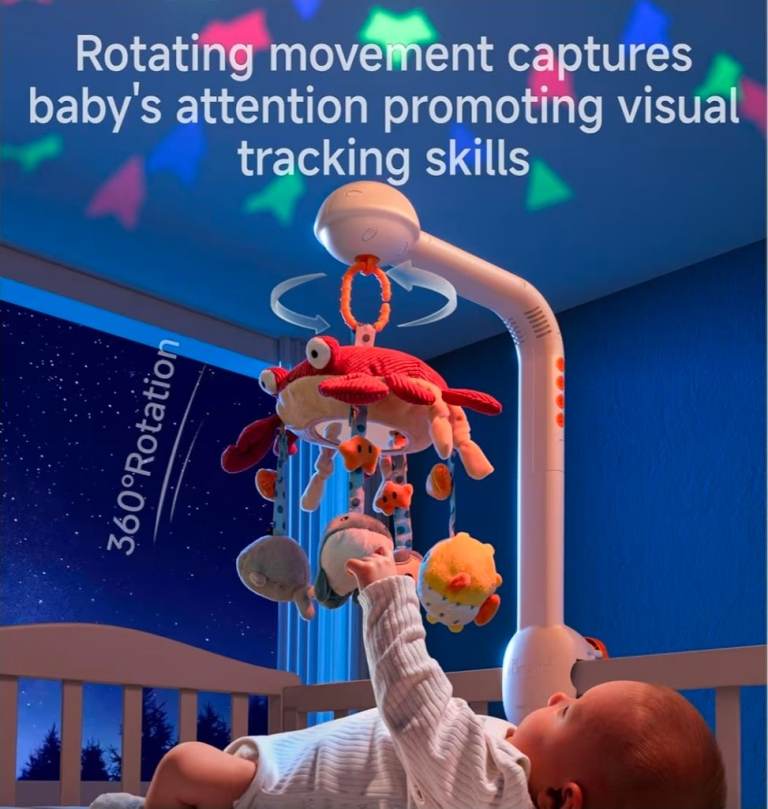 Lovely baby cot mobile with soft hanging toys, music and star projection. Designed to help soothe and entertain baby at bedtime or during quiet time.